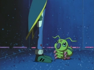 Dans sa base, le Digimon Kaiser est assis dans son fauteuil. Autour de lui, les écrans n’affichent que des images de Greymon et à ses pieds, Wormmon se frotte. Soudain, le Digimon Kaiser se rend compte que les Enfants Elus arrivent puis se lève et donne un coup de pied à Wormmon. Il s’approche d’un écran tandis que Wormmon déclare être content car il peut être toujours avec Ken maintenant.