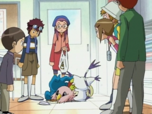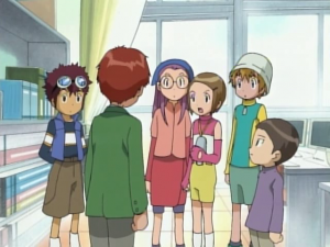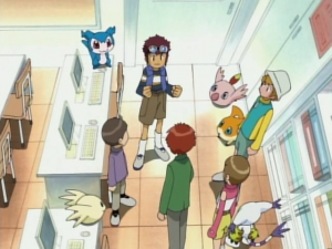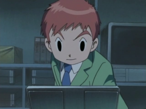 Dans la salle des ordinateurs, Koushiro est littéralement abasourdi par la nouvelle et Daisuke le répète: le Digimon Kaiser est le génie Ichijouchi Ken. Iori se demande pourquoi un garçon comme lui ferait de telles choses et Hikari n’arrive pas à y croire. Takeru se rappelle avoir vu encore un reportage sur lui à la télévision chez lui. Koushiro songe que leur ennemi était plus proche qu’il le croyait et décide d’enquêter davantage. Takeru ne semble pas comprendre et Koushiro explique qu’il veut entrer en contact avec Ichijouchi Ken. Soudain, Upamon dit qu’il est d’accord mais qu’il a faim. Koushiro fait remarquer que Miyako est en retard quand la jeune fille entre dans la salle avec un sac de nourriture. Les digimon accourent vers eux sauf Poromon qui reste un peu à l’écart car il veut des kanpyoumaki faits par la mère de Iori. Miyako demande alors s’il ne veut rien mais Poromon répond que si.