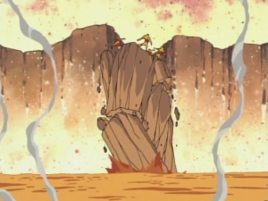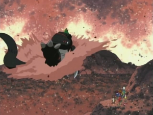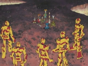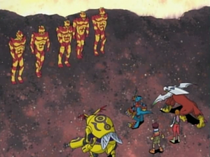 De retour au combat, Iori décide d’essayer et fait évoluer Armadimon en Digmon. Celui ci lance son attaque Big Crack qui crée une faille dans le sol et fait tomber tous les Meramon dans la lave. Cependant, ceux ci peuvent en sortir et Daisuke conseille d’être prudent. Les Meramon reviennent vers eux et Miyako s’exclame qu’il n’y a pas de fin avec eux.