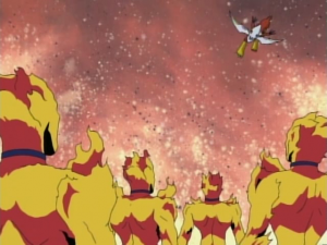 Aussitôt Hikari comprend que les attaques basées sur le feu ne peuvent pas fonctionner. Hawkmon décide d’y aller et Miyako le fait armor évoluer en Holsemon. Celui-ci lance son attaque Tempest Wing mais cela rend les flammes des Meramon bien plus grandes. Aussitôt Miyako lui crie d’arrêter car il attise leur feu.