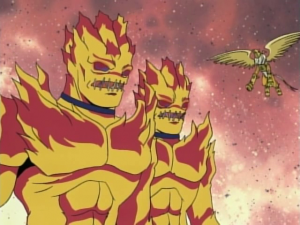 Dans le désert, les Enfants Elus avancent et Daisuke se demande où est Ichijouchi Ken quand des flux de lave s’émanent de plusieurs failles d’où sortent plusieurs Meramon. Hikari les reconnaît tout de suite et Daisuke de s’en charger. Il fait armor évoluer V-mon en Fladramon tandis que Hikari et Miyako courent se mettre à l’abri puis Fladramon lance son attaque Knuckle Fire mais elle ne fonctionne pas.