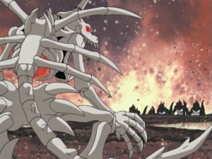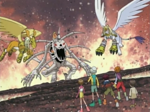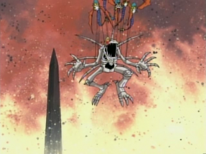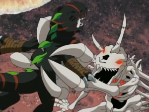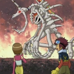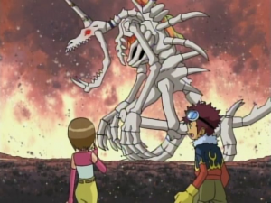 Le digimon squelettique s’approche des Enfants Elus quand Nefertimon et Pegasmon s’interposent devant eux. Nefertimon leur crie de fuir mais Hikari leur demande de venir avec eux. Pegasmon leur explique qu’ils l’occuperont et Nefertimon leur dit ainsi de trouver un endroit en sécurité.