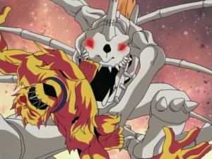 Brusquement, Skullgreymon s’en prend aux Meramon et rapidement, Fladramon, Holsemon et Digmon se précipitent vers lui. Fladramon lance son attaque Knuckle Fire mais cela ne l’affecte puis est jeté au sol où il régresse en V-mon. C’est le tour de Digmon mais lui aussi se retrouve vite à terre et redevient Armadimon. Holsemon essaie aussi mais Skullgreymon l’envoie aussi au sol et il régresse en Hawkmon.