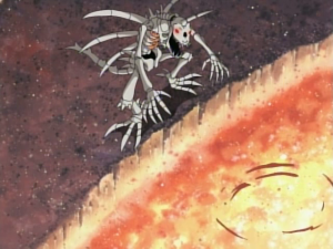 Daisuke se demande ce qui se passe et Takeru explique que le digimon attaque de son plein gré puis Miyako s’exclame que c’est de la folie. Skullgreymon jete au loin un Darktyranomon contre une montagne puis un autre dans la lave quand il se met à faiblir et régresse en Agumon avec un Evil Ring au cou.