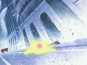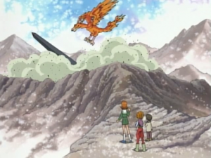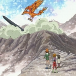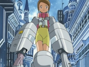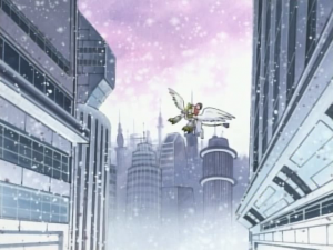 Au même moment, Pegasmon survole les lieux tandis que Takeru scrute son digivice et constate que Hikari est proche. Fladramon revient vers Daisuke et lui dit de se tenir à lui puis saute avec lui. Le garçon a un peu du mal lorsqu’il aperçoit Hikari sur Nefertimon. Elles sont pourchassées par des Guardromon quand plusieurs d’entre eux parviennent à la toucher. Nefertimon tombe au sol avec sa partenaire et régresse en Tailmon.