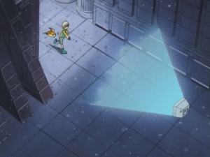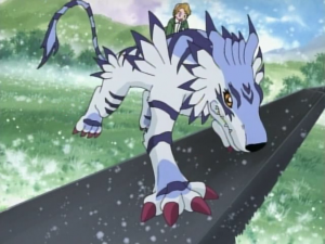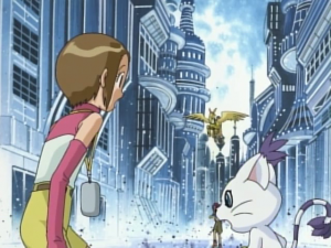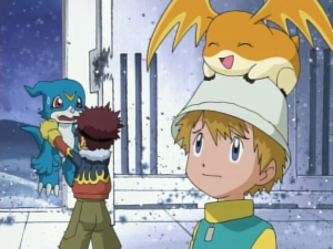 Takeru, Daisuke et V-mon le rejoignent puis Angemon ouvre la porte et, en entrant à l’intérieur, il redevient Patamon. Il dit alors à Takeru qu’il a été forcé de régresser. Daisuke est encore étonné car c’est la première fois qu’il voit évoluer Patamon comme les autres digimon. Takeru explique que Patamon est capable d’évoluer tant qu’une Dark Tower n’est pas proche. Daisuke se demande alors si le Tailmon de Hikari peut aussi évoluer et Patamon répond que celle-ci évolue en Angewomon. Daisuke semble encore plus ébranlé et Patamon s’exclame qu’ils font un joli couple. Daisuke devient furieux et ordonne à V-mon de se transformer en Ultraangemon. Il le secoue vivement et s’écrie de le faire avec du cran mais le digimon s’exclame qu’il ne peut pas. Levant la tête vers son partenaire, Takeru lui dit de ne pas plaisanter là dessus.