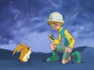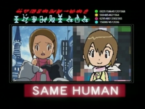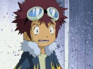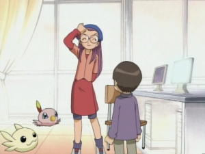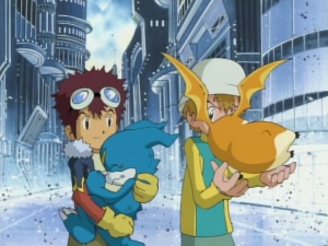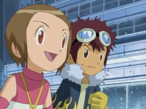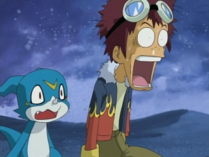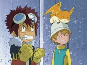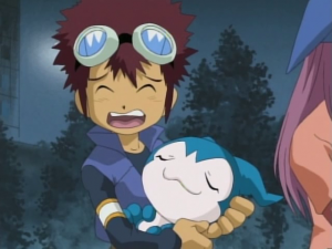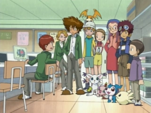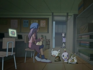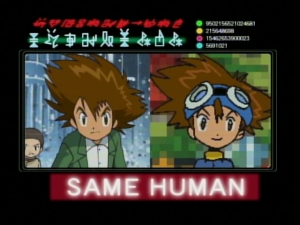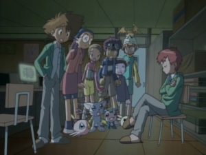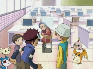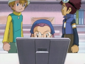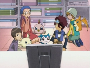 Dans la salle des ordinateurs, Upamon et Poromon mangent et Poromon se plaint qu’il n’y a pas de kanpyoumaki mais Miyako lui dit de ne pas être si égoïste. Soudain, Iori avec Taichi. Il dit que Taichi est arrivé et celui-ci s’excuse de son retard.