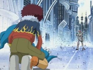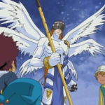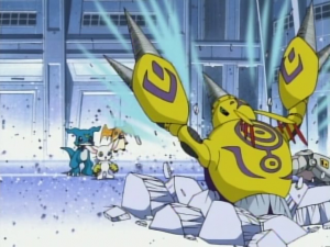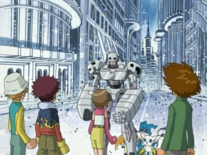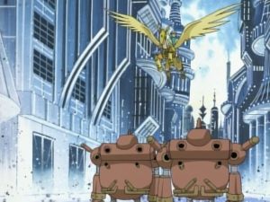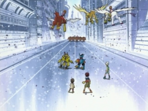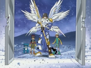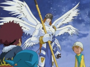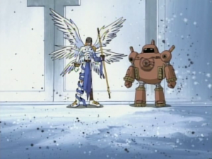 Takeru s’exclame qu’ici, ils peuvent évoluer normalement et, sous les regards très étonnés de Daisuke et V-mon, Angemon vole jusqu’à Guardromon et l’empêche de bouger d’un coup de sceptre puis leur dit de se dépêcher.