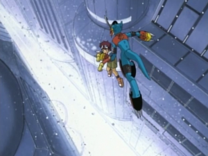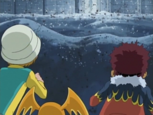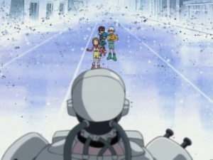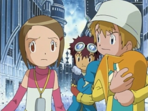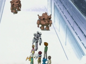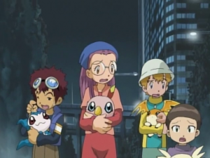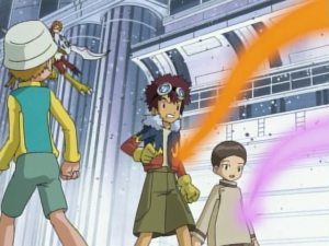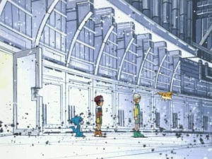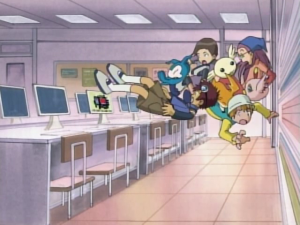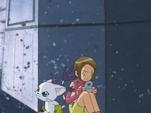 Ayant atterri dans la salle des ordinateurs, les enfants et les digimon sont entassés quand Miyako réalise qu’elle a entendu quelque chose exploser. Patamon répond que c’était un Guardromon. Daisuke se demande subitement où est Hikari et Iori suppose qu’elle doit être restée au Digital World avec un léger frisson dans la voix.
