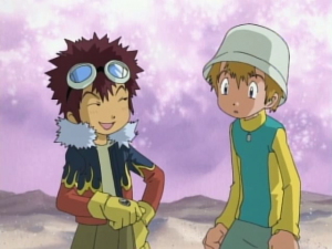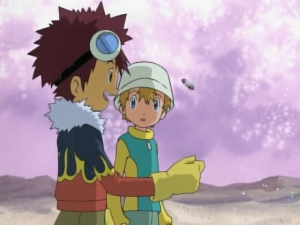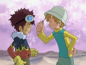 Au Digital World, Daisuke et Takeru marchent à travers un désert quand Daisuke se rend compte que la nuit tombe et suggère à Takeru de rentrer. Le garçon dit que sa mère rentre tard aujourd’hui et ajoute que c’est Daisuke qui devrait rentrer car sa famille va s’inquiéter. Ce dernier répond qu’il ne s’en soucie pas puis décide d’utiliser le sort pour savoir qui ira sauver Hikari. Il prend alors une pièce et annonce que face, c’est Takeru qui rentre et pile ce sera Daisuke. Il la lance en l’air et celle-ci retombe côté face. Takeru lui arrache alors la pièce des mains et constate que c’est une pièce à double face et ajoute qu’ils en vendent à Kadoichi. Daisuke paraît confus puis Takeru sourit et propose d’y aller ensemble. Daisuke accepte et tous deux repartent.