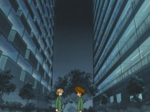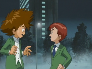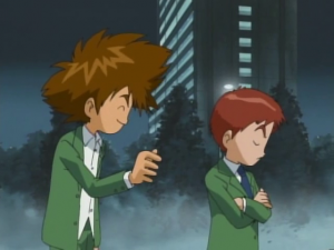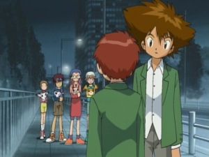 Quelque part dans les rues, Taichi rencontre, plus ou moins par hasard, Yamato et celui-ci lui dit que Iori lui a tout raconté. Taichi lui annonce qu’il doit y aller mais avant il doit aussi inventer une histoire à la famille de Daisuke. Yamato décide de s’en occuper et dit de se dépêcher d’aller sauver Hikari. Taichi s’éloigne en courant et lui crie qu’il lui confie le reste. Yamato songe alors qu’il devait préparer le dîner pour son père puis court lui aussi.