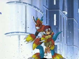 Pendant ce temps, Daisuke et Takeru font armor évoluer V-mon et Patamon en Fladramon et Pegasmon. Tous deux utilisent leurs attaques Neddle Rain et Knuckle Fire pour arrêter des Guardromon puis Fladramon saute au-dessus d’eux et crie à son partenaire de se dépêcher Ce dernier court mais est un peu gêné.