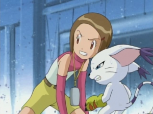Au Digital World, Hikari s’est cachée et envoie un e-mail à ses amis tandis que Tailmon fait le guet. Elle demande à sa partenaire de la faire armor évoluer en cas de problème et assure qu’elle peut encore combattre. Hikari remercie alors Tailmon.