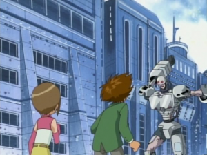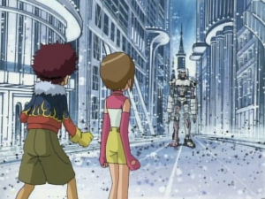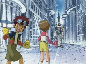 Près de Hikari, Daisuke dit à son amie de se dépêcher de partir quand un Andromon apparaît devant eux.