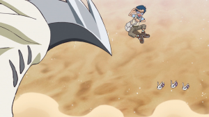 Garurumon saute sur la pince et la colle au sol. Dans le même temps, Kyaromon est propulsé dans les airs mais rattrapé par Sora qui lui assure qu’il est à présent en sécurité. Garurumon affronte les pattes et al pinces mais Yamato prend conscience que leur adversaire, au travers du sable, anticipe leurs mouvements. Il ordonne à son partenaire d’attaquer aux griffes puis crie aux autres de fuir. Garururumon porte encore quelques attaques puis leur ennemi semble vaincu.