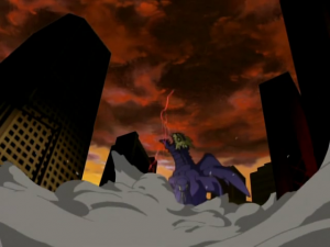 Susanoomon retourne vers Lucemon et s’approche de la tête puis aperçoit la sphère entre ses bras. Dedans, il perçoit un être : Lucemon mode Larva. Ce dernier brille et le repousse. Susanoomon s’effondre et retombe vers le sous-sol puis un déluge de flammes se déferle. Une bulle protectrice enveloppe alors Bokomon, Neemon et le trio. Lucemon se pose et appuie sa patte sur Susanoomon et le tient ainsi à sa merci. Lucemon mode Larva s’exclame que toute résistance est vaine et qu’il va disparaitre, comme le Digital World. Des rais de lumière recouvrent tout et menacent de tout supprimer.