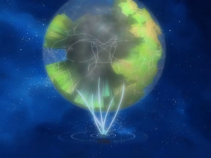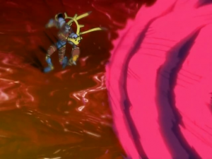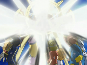 Brusquement, Patamon aperçoit Lucemon mode Larva attaquer par derrière Susanoomon. Immédiatement, Susanoomon fait sortir les cinq enfants de son corps puis absorbe l’attaque. Lucemon mode Larva affirme que le monde est à lui. Susanoomon saisit son épée puis tous les dix Spirits attaquent Lucemon mode Larva qui se désintègre.