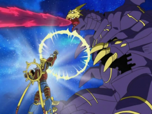 Susanoomon réussit à se relever et fonce vers Lucemon qui tente de le repousser puis pénètre dans la sphère. Lucemon mode Larva panique et redoute que son adversaire ait atteint son niveau. Il se met à attaquer Susanoomon qui tente de se protéger et approche lentement de leur ennemi. Il le frappe enfin d’un coup de poing et le transperce. Au même moment et l’attaque lumineuse rétrécit et disparait. Lucemode mode Satan crache un jet de flammes répété dans toutes les directions. Susanoomon l’achève d’une attaque faisant tomber huit fois la foudre sur l’ennemi puis le découpe avec sa longue et large épée. Les données s’échappent et vont peu à peu reformer le Digital World.
