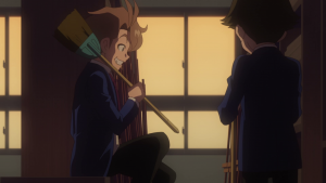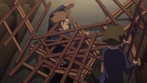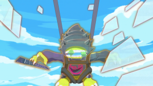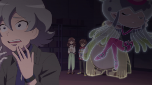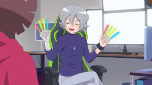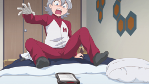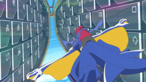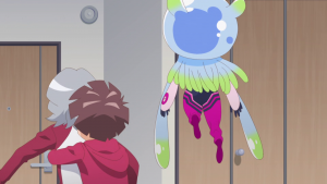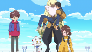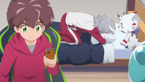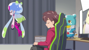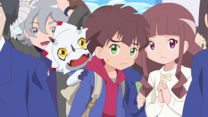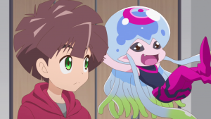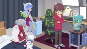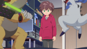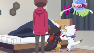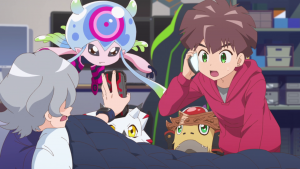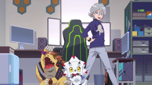 Durant ce temps, dans une remise de l’internat, Nomura discute avec un ami et essaie de montrer quelque chose. Devant le signal qui ne passe pas, il bouge et des chevalets lui tombe dessus. Hiro le découvre, stupéfait, et le mène à l’infirmerie. En ressortant, Nomura constate que l’article disait vrai et qu’il a bien été blessé. Hiro se rend dans la chambre de Kiyôshiro et aperçoit Gammamon affronter avec une sorte d’épée Ruydamon. Gammamon s’exclame qu’ils s’entraînent et Ryudamon ajoute qu’il devient plus fort. Kiyôshiro révèle qu’il est prêt pour le concert d’un groupe d’idoles et dévoile une chorégraphie répétée avec les deux digimon. Jellymon souffle à Hiro que c’est un groupe qui sont les doubleuses de son animé préféré.