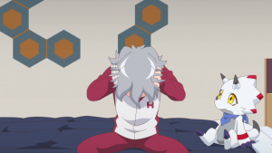 Refusant de mourir, Kiyôshiro se décide à rester enfermé dans sa chambre, dans son lit. Des mains surgissent soudain sous ses couvertures et le poussent hors du lit. Les mains se posent ensuite sur ses épaules et le garçon s’empresse de quitter la pièce. Il se réfugie sur le toit, certain que rien ne saura lui tomber dessus, lorsqu’au-dessus de sa tête, un mystérieux digimon lâche un pot de fleurs. Heureusement, Espimon se précipite pour casser le pot et sel un petit morceau frappe le crâne du jeune homme.