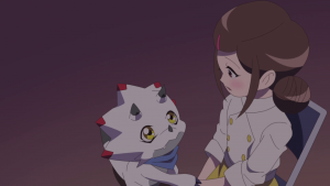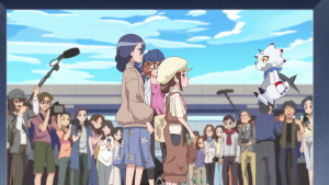 Dans une voiture, le groupe s’inquiète de la menace, notamment la plus jeune, mais leur manger assure que la police est avertie et leur conseille de laisser les adultes gérer. En arrivant sur les lieux du tournage de leur clip, elles saluent leur public lorsque Gammamon s’avance et appelle Anna, la plus jeune, en répétant qu’elle est sa petite sœur et qu’il la protégera. Elle le trouve mignon et le prend dans ses bras. Grâce à cela, l’équipe est invitée dans leur loge. Ils apprennent ce qui produit avec les articles du site mais les deux aînées rapportent les avoir ignoré lorsqu’Anna avoie avoir dit que c’était stupide. Elle redoute de mourir et Kiyôshiro tente de dire qu’il la protégera, mais Gammamon le coupe et le dit à sa place. Devant les digimon, Jellymon prétend aux filles que ceux-ci sont des intelligencse artificielles évoluées destinées à la sécurité.
