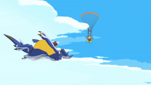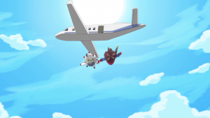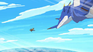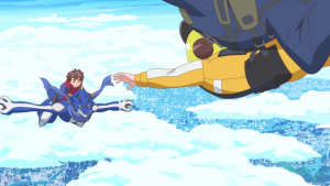 Depuis un avion, Anna se prépare tandis que Kiyôshiro tremble. Hiro suppose que si le fantôme tente quelque chose, ce sera pendant le saut. Alors qu’Anna saute, le digimon assomme le moniteur qui l’accompagne. Un second moniteur tente d’agir mais le digimon le rejette à l’intérieur. Jellymon l’affronte alors que Gammamon plonge avec Hiro. Dans le plongeon, Hiro fait évoluer Gammamon en KausGammamon. Il se précipite vers Anna et Hiro lui crie comment ouvrir le parachute. Elle obéit et est ainsi en sécurité. Anna demande s’il est Gammamon, ce que KausGammamon confirme et rappelle qu’il la protégera. Soudain, le digimon surgit et s’exclame qu’ils n’ont aucun droit d’interférer dans les sources d’un journaliste. Il annonce être Publimon et laisser ses articles libres d’accès mais tous ne cessent de critiquer. KausGammamon esquive son attaque, puis l’assaille. Il s’écrie que la mort d’Anna fera un grand scoop. Depuis le sol, Ruri aperçoit le combat contre le digimon inconnu. Hiro lance qu’il ne fait que créer des accidents pour fabriquer ses nouvelles, mais Publimon réplique qu’un grand journaliste sait écrire sur le futur pour gagner plus de lecteurs.  Le combat se poursuit lorsque Publimon coupe le parachute d’Anna. KausGammamon se précipite pour récupérer Anna, puis le moniteur. Les attaques ne cessent de les assaillir jusqu’au moment où Publimon s’écrase au sol et meurt. KausGammon redevient Gammamon redevient Gammamon et Anna le prend dans ses bras en éclatant en sanglots. Hiro apprend eb même à Ruri l’identité de leur ennemi défunt.