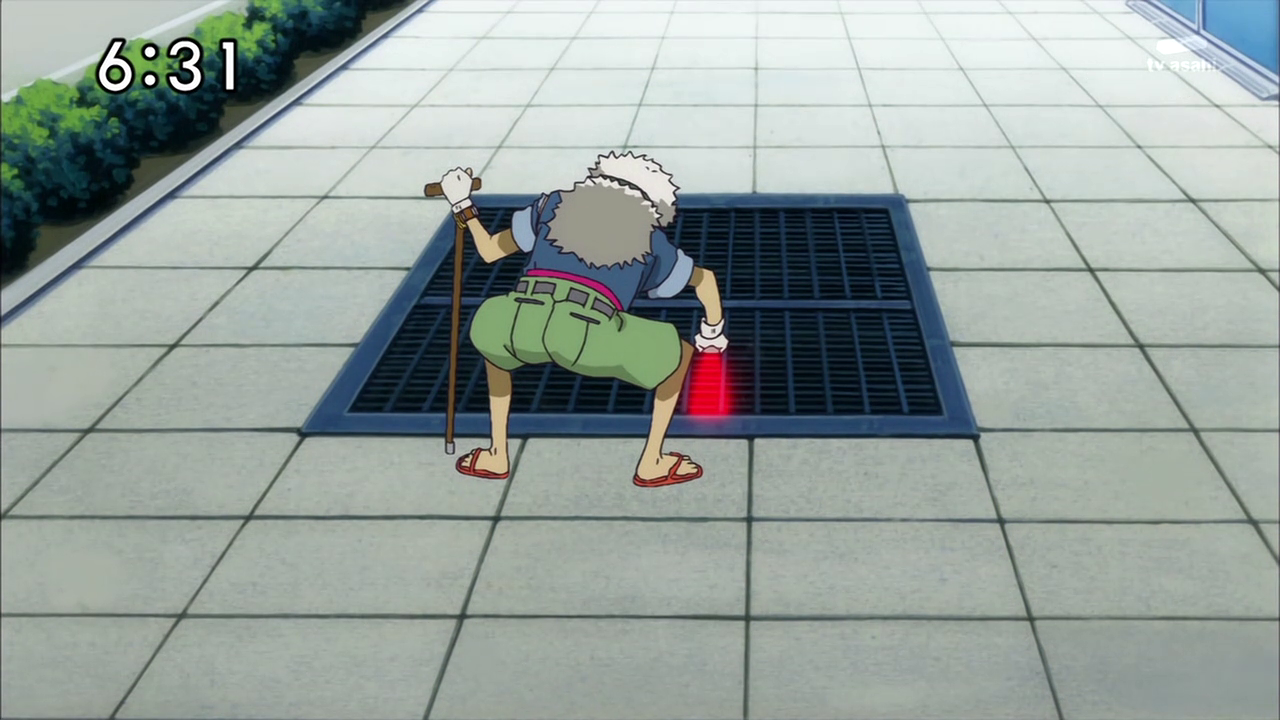 Nous retrouvons à présent Tagiru et Grumdramon qui courent en pleine rue pour s’entrainer. Grumdramon court dans la rue et n’importe quel passant pourrait ainsi le voir… D’accord, c’est bon, ils ne font plus aucun effort pour cacher les digimon ! Ils tombent soudain sur le vieil homme qui fait un truc bizarre à une bouche d’égout et Tagiru le questionne et le vieux répond… qu’il se promène !!!