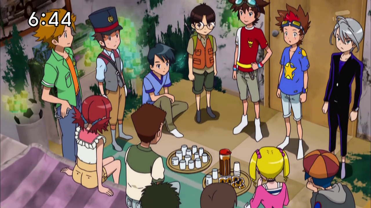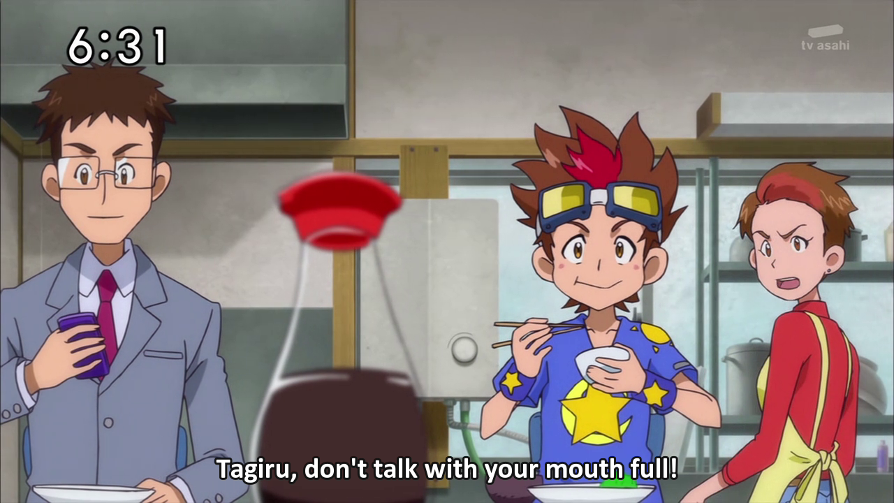 Et alors qu’il mange et se trouve avec ses parents, il parle de choses liées aux digimon. Débile ? Bah, c’est Tagiru et Digimon Hunters ! Pourquoi s’étonner ? La débilité est la marque de fabrique de cette série. ! Tagiru songe que le vieil homme est suspect et décide d’aller inspecter l’endroit où il se trouvait après les cours. Hum… Pourquoi ne pas l’avoir fait directement quand il était encore sur place ? Son père quitte ensuite la maison et Tagiru semble remarquer un phénomène qui l’intrigue mais pense avoir peut-être mal vu.