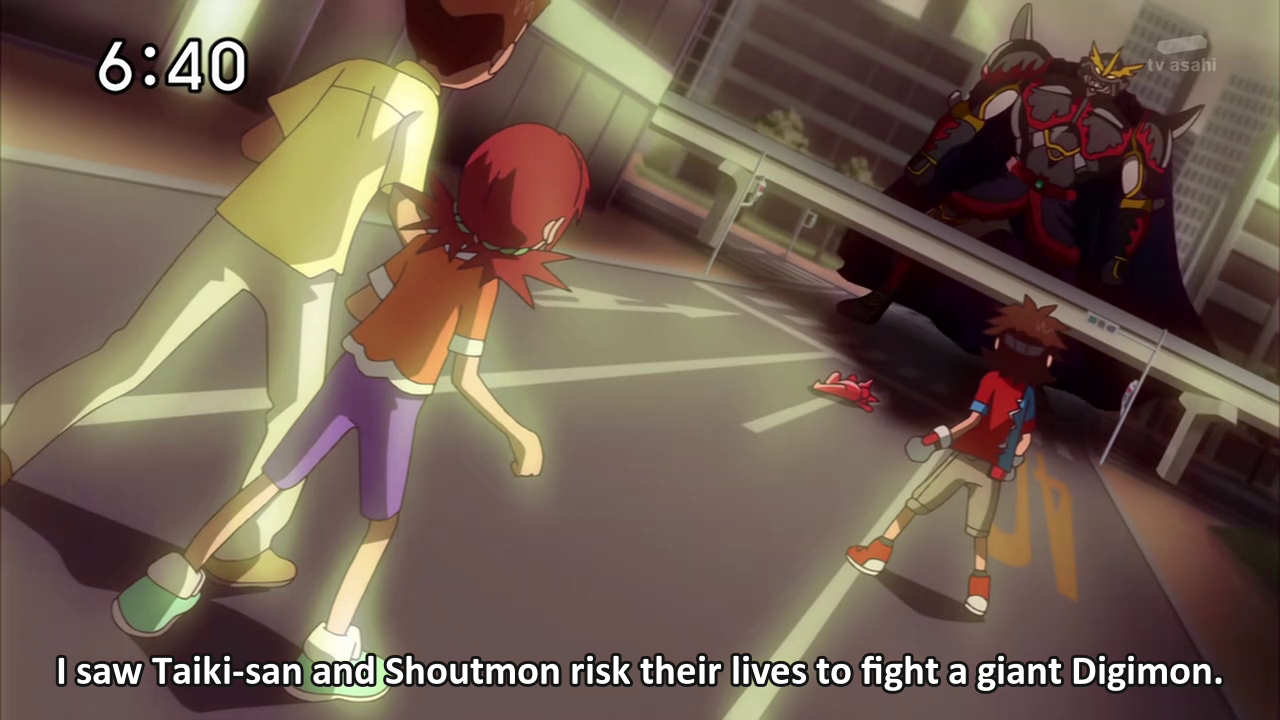 Chrysalimon s’enfuit alors dans le sol. Nous retrouvons ensuite Tagiru et Ryoma à observer leur ville transformée. Tagiru remercie Ryoma et celui-ci dit qu’il vient de voir ses parents disparaitre et dit que c’est normal d’être secoué. Tagiru s’étonne que Ryoma puisse être si être calme et Ryoma explique avoir déjà vécu une situation similaire, un jour d’été, alors que Taiki et Shoutmon combattait un digimon géant.