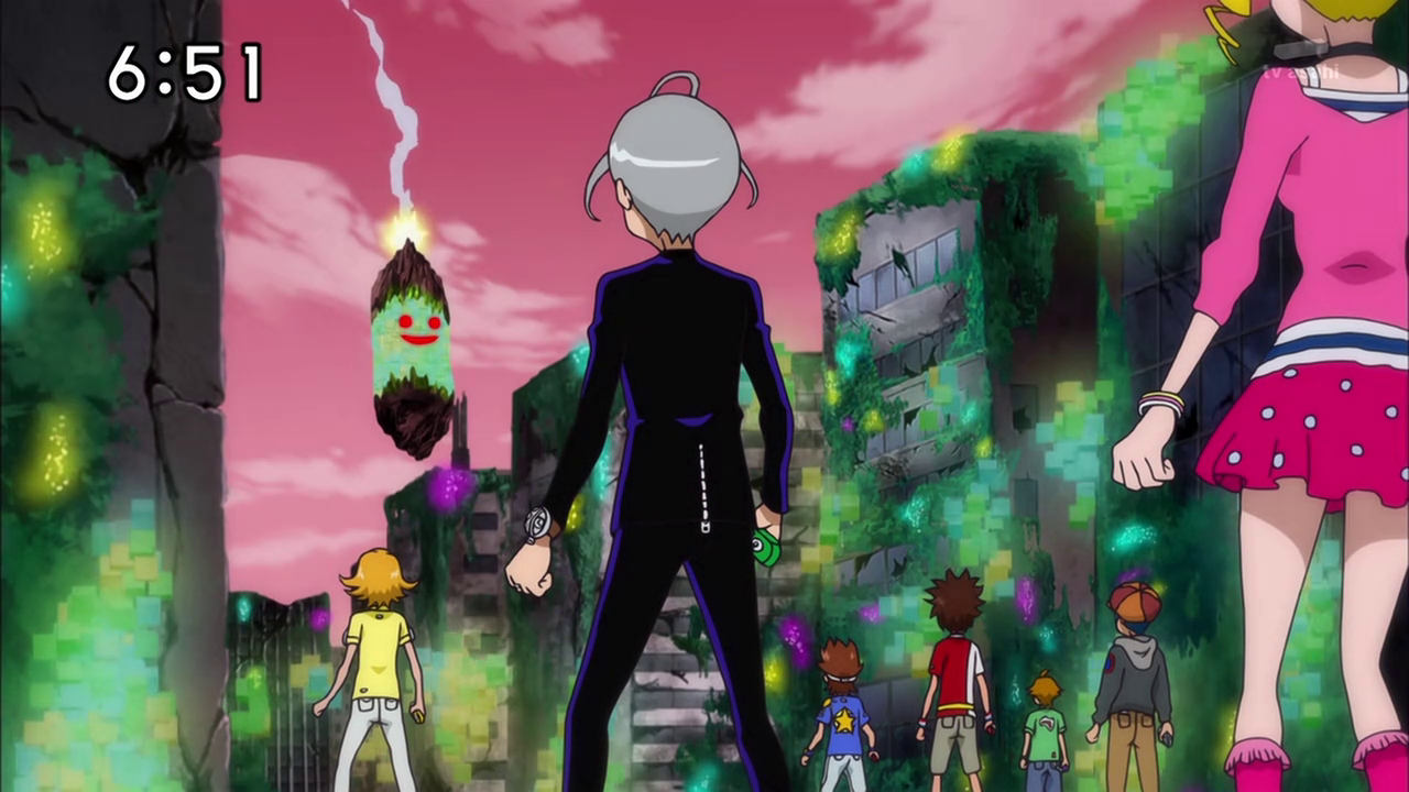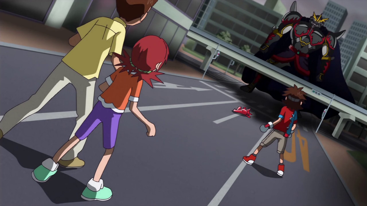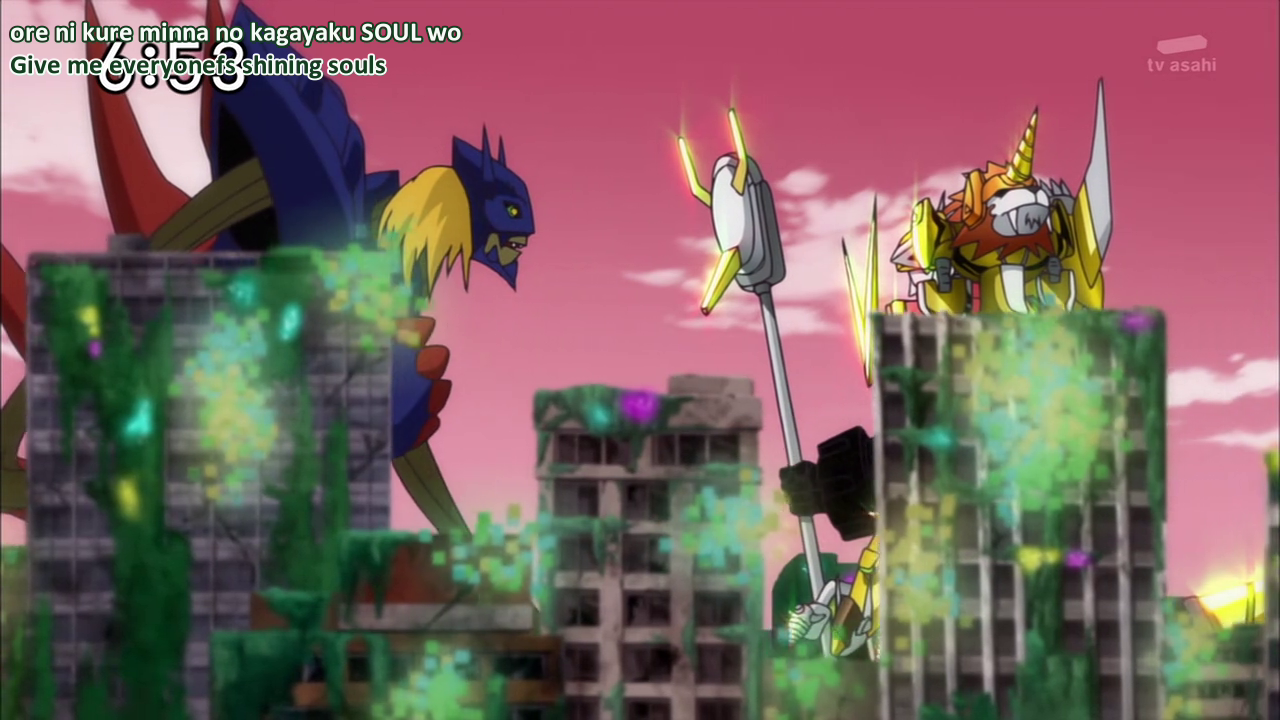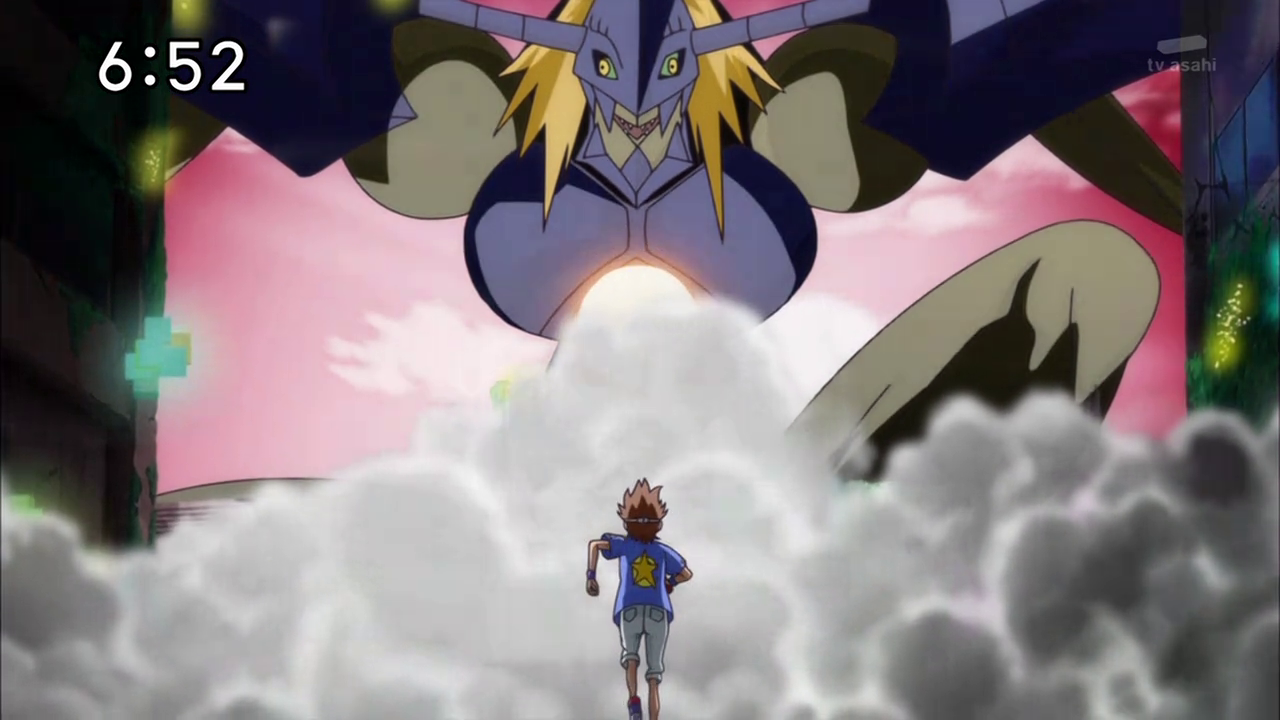 Au même moment, les Hunters sont rassemblés devant la Tour de Tokyo et aperçoivent à nouveau Kurasarimon absorber l’énergie du monde réel pour ensuite évoluer en Infermon. Et la prochaine étape : Diablomon ! Je l’ai dit : aucune originalité ! Le digimon s’approche d’eux et Taiki ordonne à tout le monde de faire évoluer son partenaire.