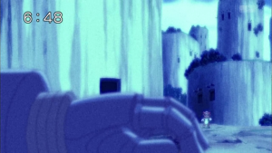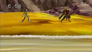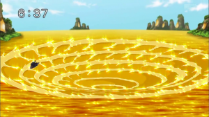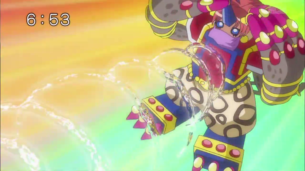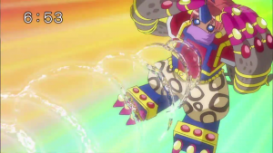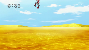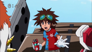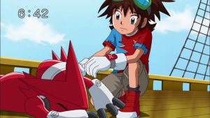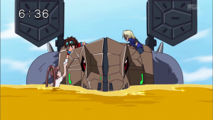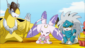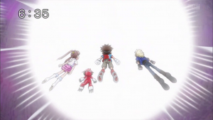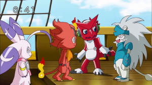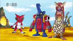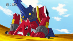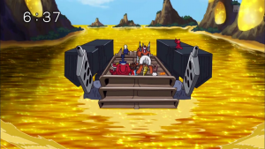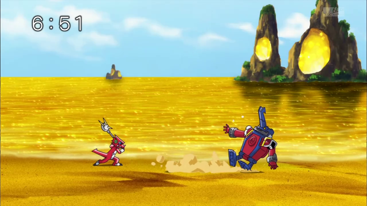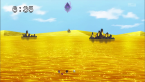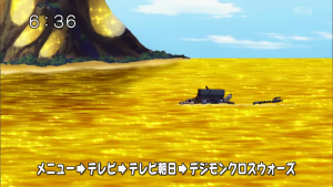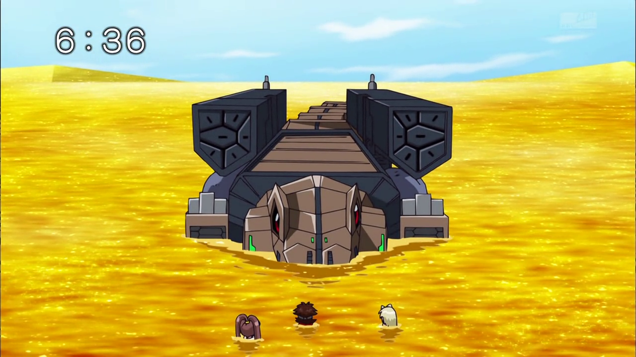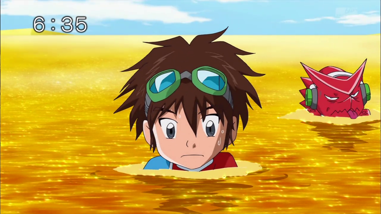 En sortant, le groupe émerge dans le ciel et tombe dans ce qui semble être un océan doré. Shoutmon recrache voilement une gorgée d’eau, écœuré, et s’écrie que c’est salé. Kiriha fait appel à Deckerdramon. Les garçons le rejoignent en premier et Taiki aide ensuite Nene à monter à bord. Dekerdramon rit et déclare qu’il aimerait que Kiriha soit plus ouvert sur ses sentiments. Kiriha marmonne qu’en dépit de sa force, il n’utilise que peu en raison de ses commentaires. Deckerdramon s’en amuse et s’exclame que son maître est toujours comme cela puis commence à avancer. Il nage autour d’îles qui émerveille Shoutmon. Ballistamon dit à un moment se sentir étrange lorsque Dorurumon est perturbé de ne pas apercevoir le drapeau de l’ennemi flottant dans le ciel. A la place, ils ne voient que le grand cristal foncé.