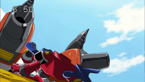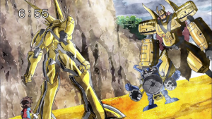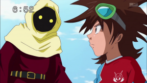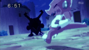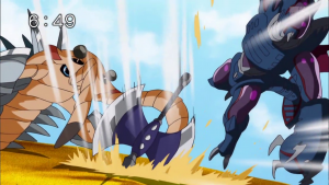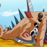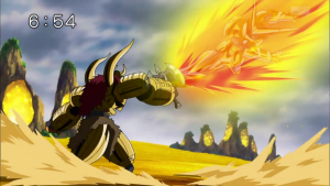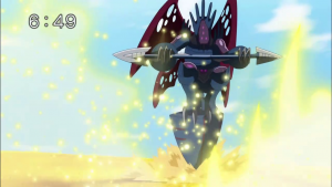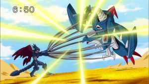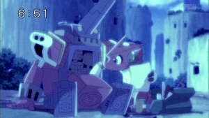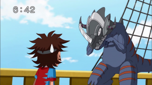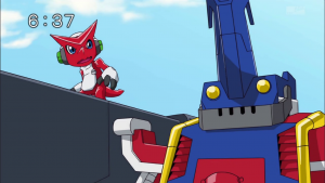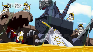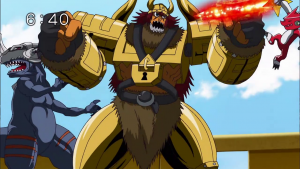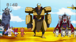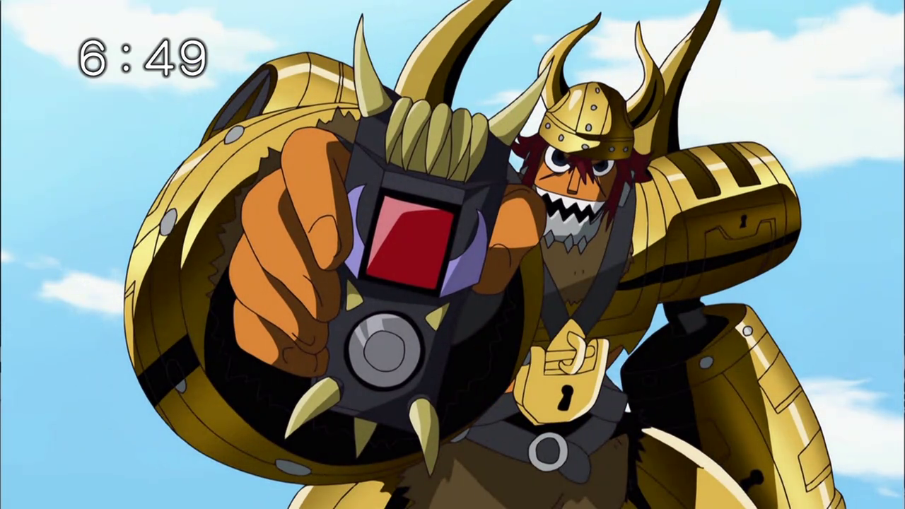 Ballistamon accourt soudain vers Ballistamon et le plaque au sol en hurlant d’arrêter. Olegmon essaie de les rejoindre mais Beelzebumon le repousse d’un tir de canon. Ballistamon rappelle à Shoutmon qu’il avait pareil autrefois, quand il attaquait tout, malgré les recommandations de Jijimon, et s’est approché pour réparer ses mécanismes. Ballistamon répète que Shoutmon lui a sauvé la vie et qu’ils sont amis et qu’il fera la même chose. Shoutmon fait apparaitre sa lance et l’attaque violemment. Malgré les assauts, Ballistamon résiste. Shoutmon demande pourquoi il ne tombe pas et Ballistamon rappelle que Shoutmon n’était pas tombé non plus.