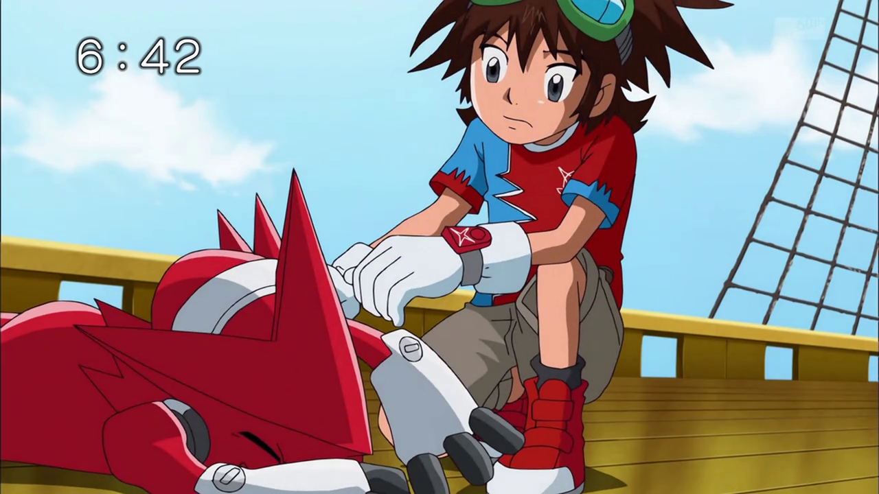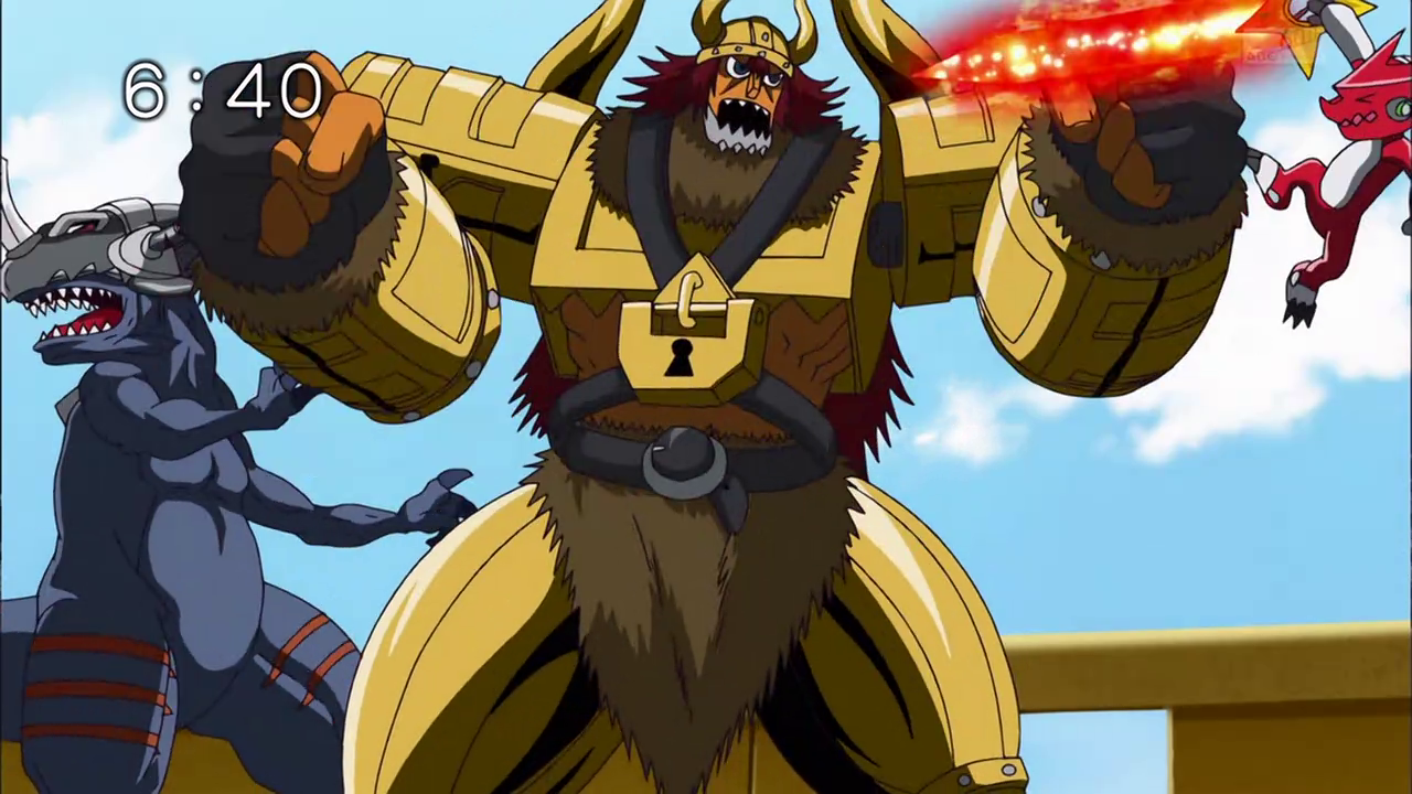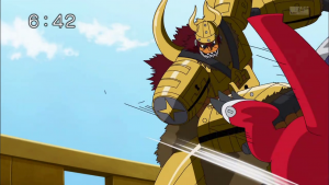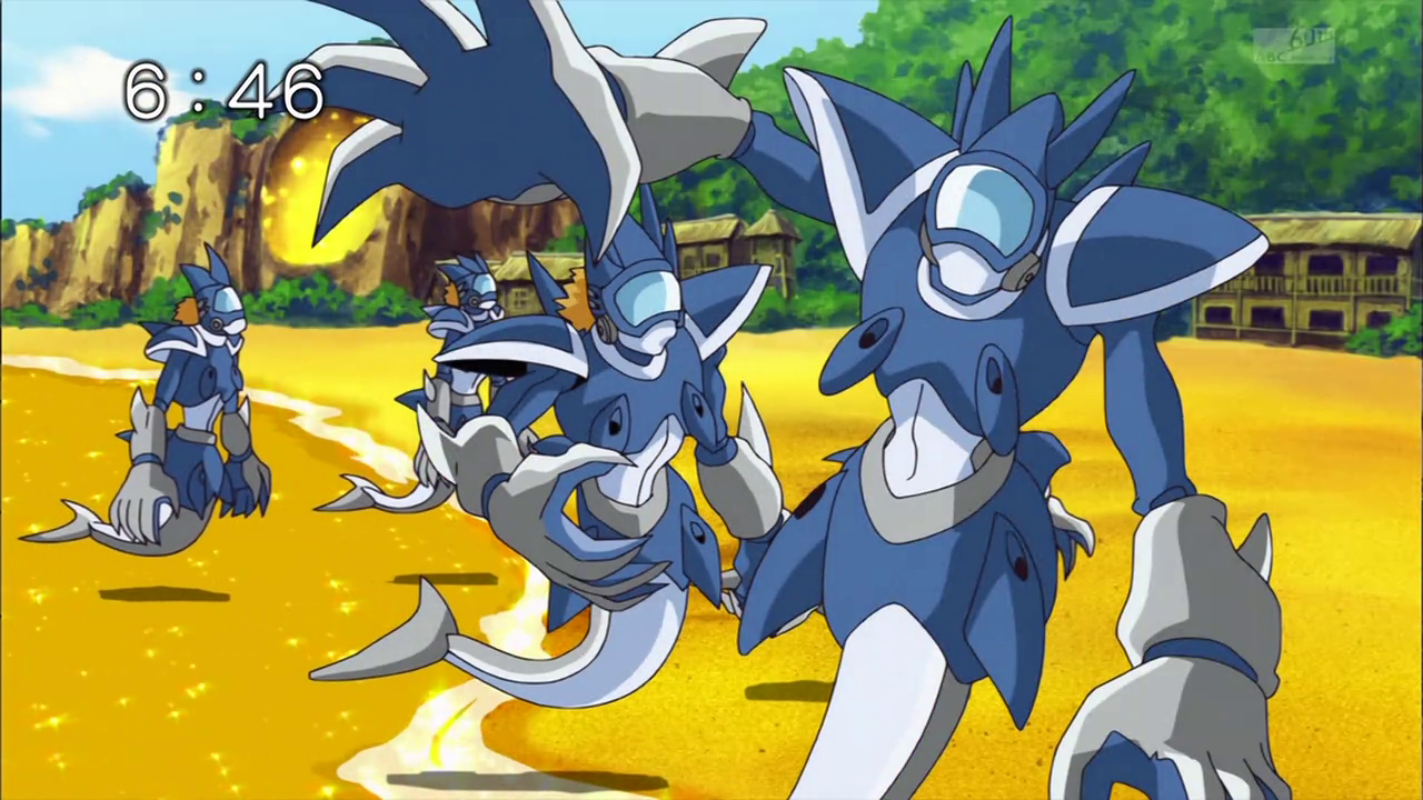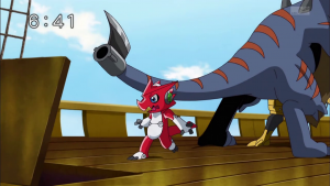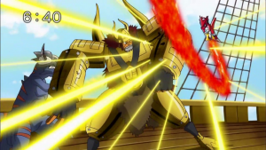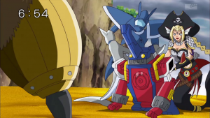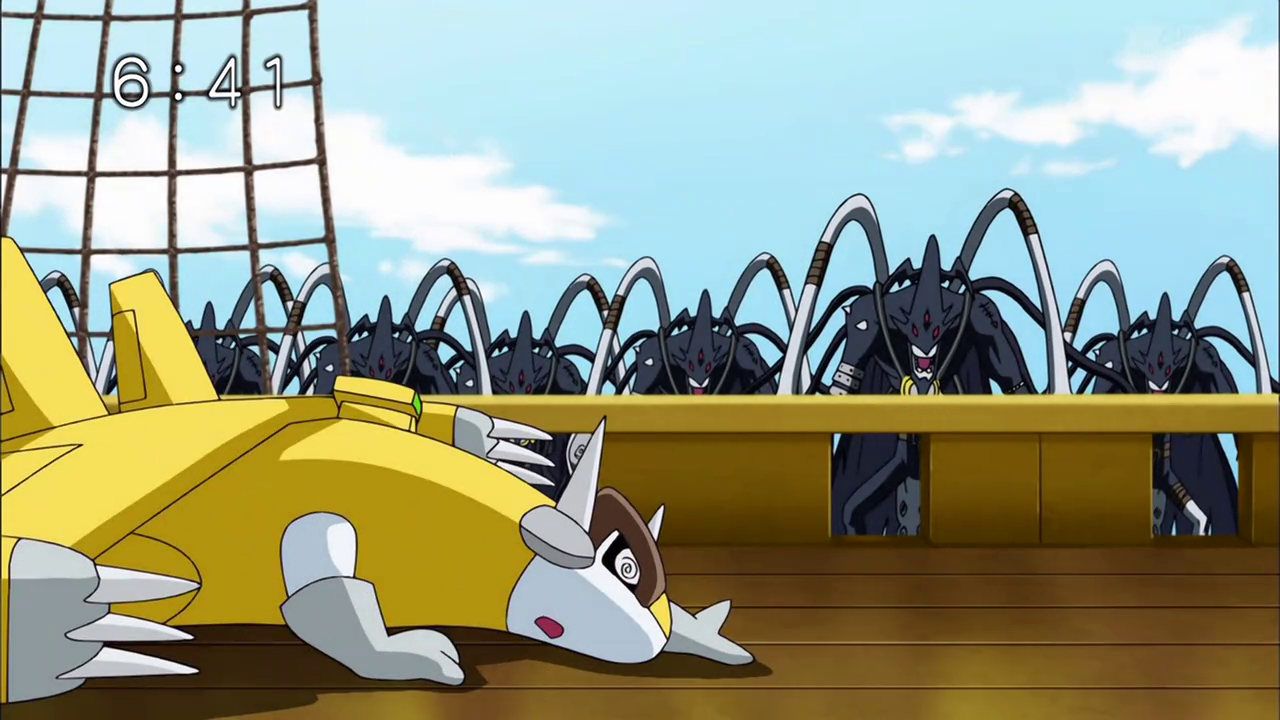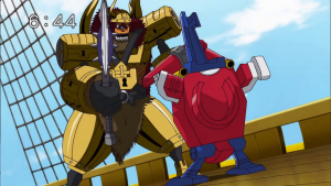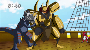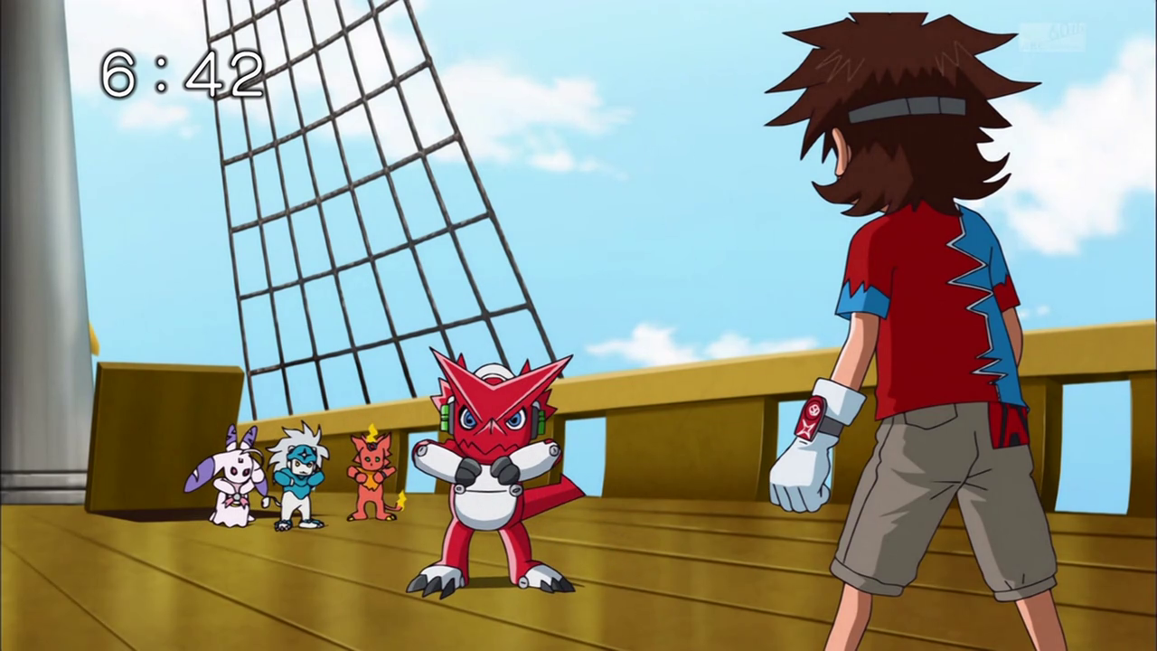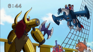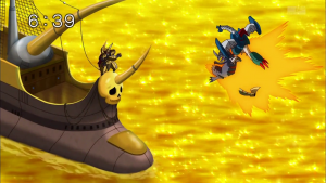 Kiriha s’écrie que c’est ridicule et que cela n’arrivera jamais. Il fait sortir MailBirdramon et Greymon puis s’écrie qu’ils vont anéantir Olegmon. Olegmon rappelle ne pas faire une mauvaise offre puis révèle que l’océan est le drapeau de ce royaume et ils ne pourront en sortir sans monter à bord de son navire. Kiriha annonce qu’ils vont alors voler ce vaisseau. Mailbirdramon et Greymon attaquent mais Olegmon fait apparaitre deux hache et les jette sur le pont. Il fait ensuite appel à Mermaimon. Une sirène digimon sort des eaux puis ordonne à une horde de Depthmon et MarineDevimon d’apparaitre. Nene fait appel à Sparrowmon et Mervamon. Mervamon a un commentaire sec sur Mervamon, ce qui intrigue Sparrowmon qui ne comprend pas. Shoutmon crie à Taiki de ne pas laisser Kriha tout faire. Taiki sort Beelzebumon, Knightmon, les Pawnchessmon, les Starmonz et Pickmon puis réalise avec les Starmonz et Pickmon une digixross qui donne une épée. Shoutmon l’utilise pour attaquer Olegmon. Greymon fait de même. Au même moment, Mervamon se confronte à Mermaimon. Shoutmon et Greymon sont repoussés. Shoutmon constate que celui-ci est bien un Death Général et que ses muscles ne sont pas pour la représentation.