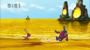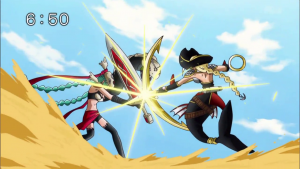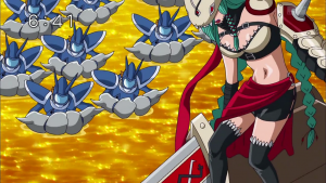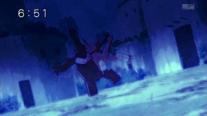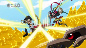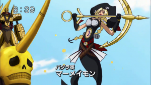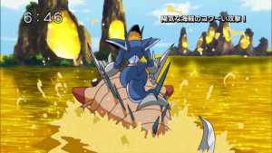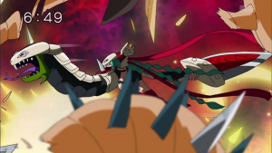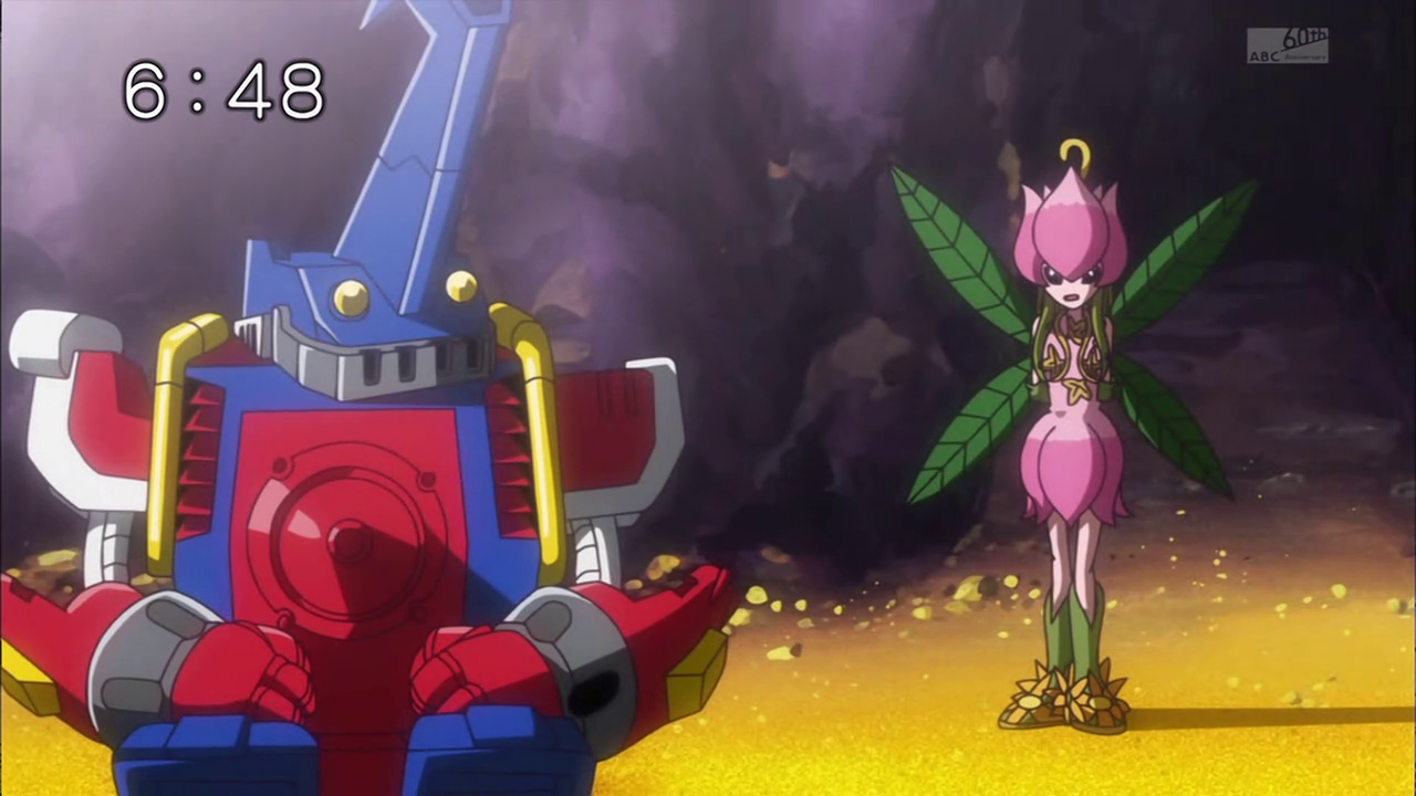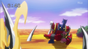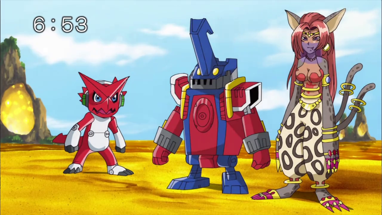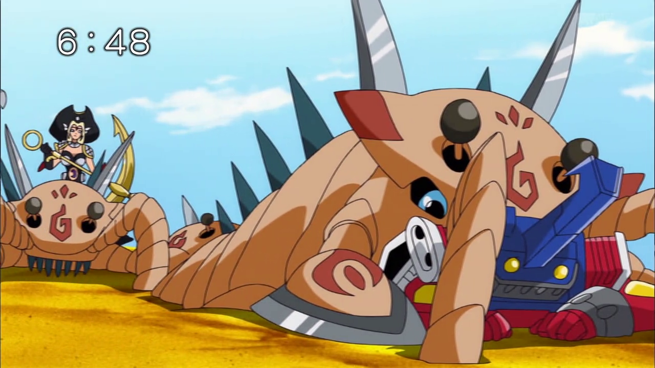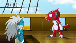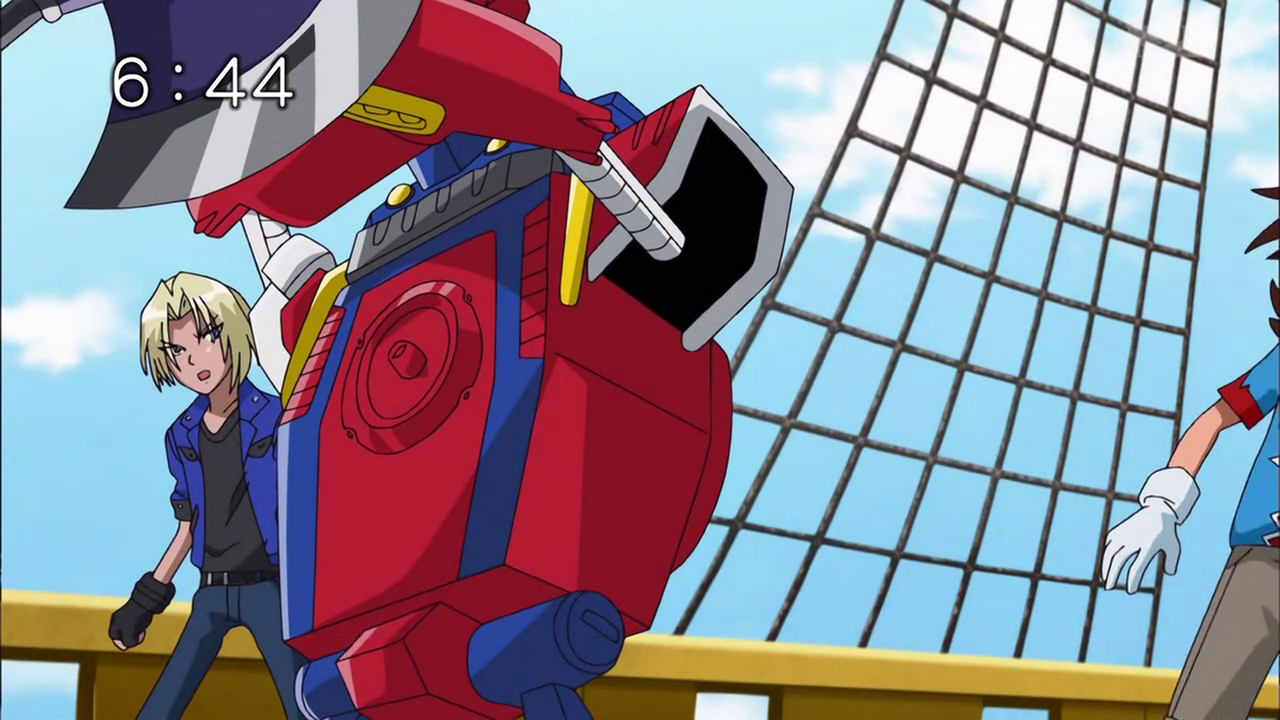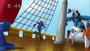 Kiriha s’écrie que c’est ridicule et que cela n’arrivera jamais. Il fait sortir MailBirdramon et Greymon puis s’écrie qu’ils vont anéantir Olegmon. Olegmon rappelle ne pas faire une mauvaise offre puis révèle que l’océan est le drapeau de ce royaume et ils ne pourront en sortir sans monter à bord de son navire. Kiriha annonce qu’ils vont alors voler ce vaisseau. Mailbirdramon et Greymon attaquent mais Olegmon fait apparaitre deux hache et les jette sur le pont. Il fait ensuite appel à Mermaimon. Une sirène digimon sort des eaux puis ordonne à une horde de Depthmon et MarineDevimon d’apparaitre. Nene fait appel à Sparrowmon et Mervamon. Mervamon a un commentaire sec sur Mervamon, ce qui intrigue Sparrowmon qui ne comprend pas. Shoutmon crie à Taiki de ne pas laisser Kriha tout faire. Taiki sort Beelzebumon, Knightmon, les Pawnchessmon, les Starmonz et Pickmon puis réalise avec les Starmonz et Pickmon une digixross qui donne une épée. Shoutmon l’utilise pour attaquer Olegmon. Greymon fait de même. Au même moment, Mervamon se confronte à Mermaimon. Shoutmon et Greymon sont repoussés. Shoutmon constate que celui-ci est bien un Death Général et que ses muscles ne sont pas pour la représentation.