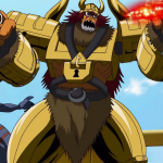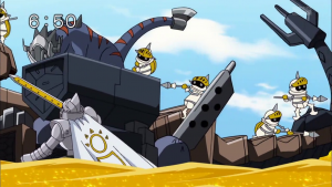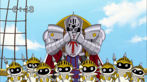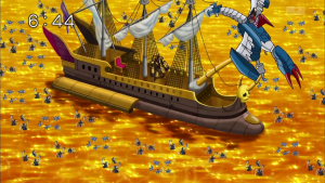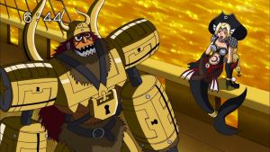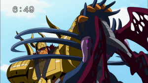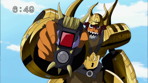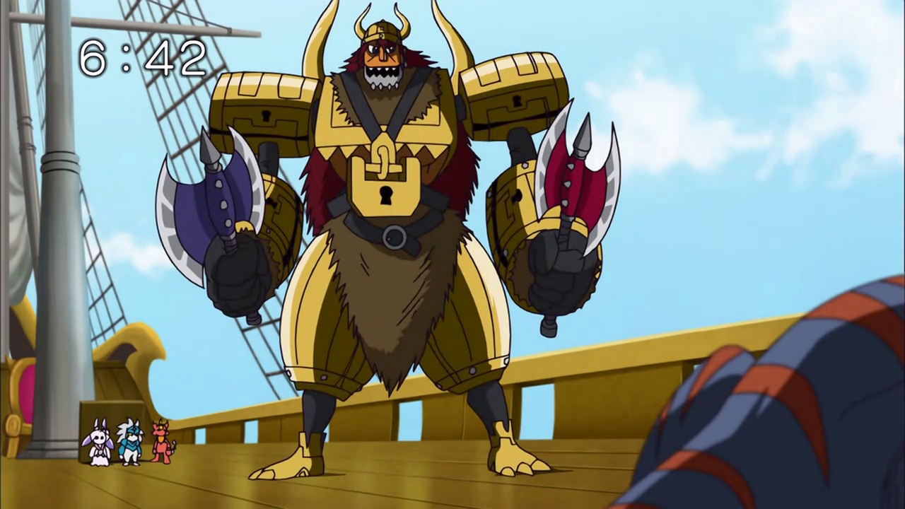Soudain, les vagues s’accélèrent et créent un tourbillon dans lequel Deckerdramon est aspiré. Un vaisseau en émerge et Kiriha comprend aussitôt que c’est le royaume du Death Général. A la proue du navire trône un digimon pirate à l’air féroce. Il les accueille à la mer d’or Gold land puis se présente comme Olegmon, un des sept Death Généraux. Ce nom semble éveiller des souvenirs à Ballistamon. Dorurumon est tendu et Shoutmon prêt à combattre. Olegmon admire leur énergie juvénile puis se met à réciter une incantation. Il explique que quiconque la chante deviendra un membre de son équipage. Taiki est surpris de cela. Olegmon rapporte avoir entendu les récits racontant leurs différentes victoires sur les quatre Death Généraux précédents avec trente digimon seulement menés par Shoutmon et s’en montre impressionné. Il reconnait leur force et souhaite ainsi les intégrer à son équipage.