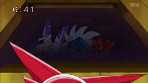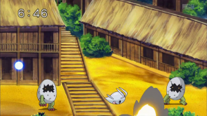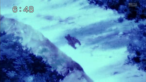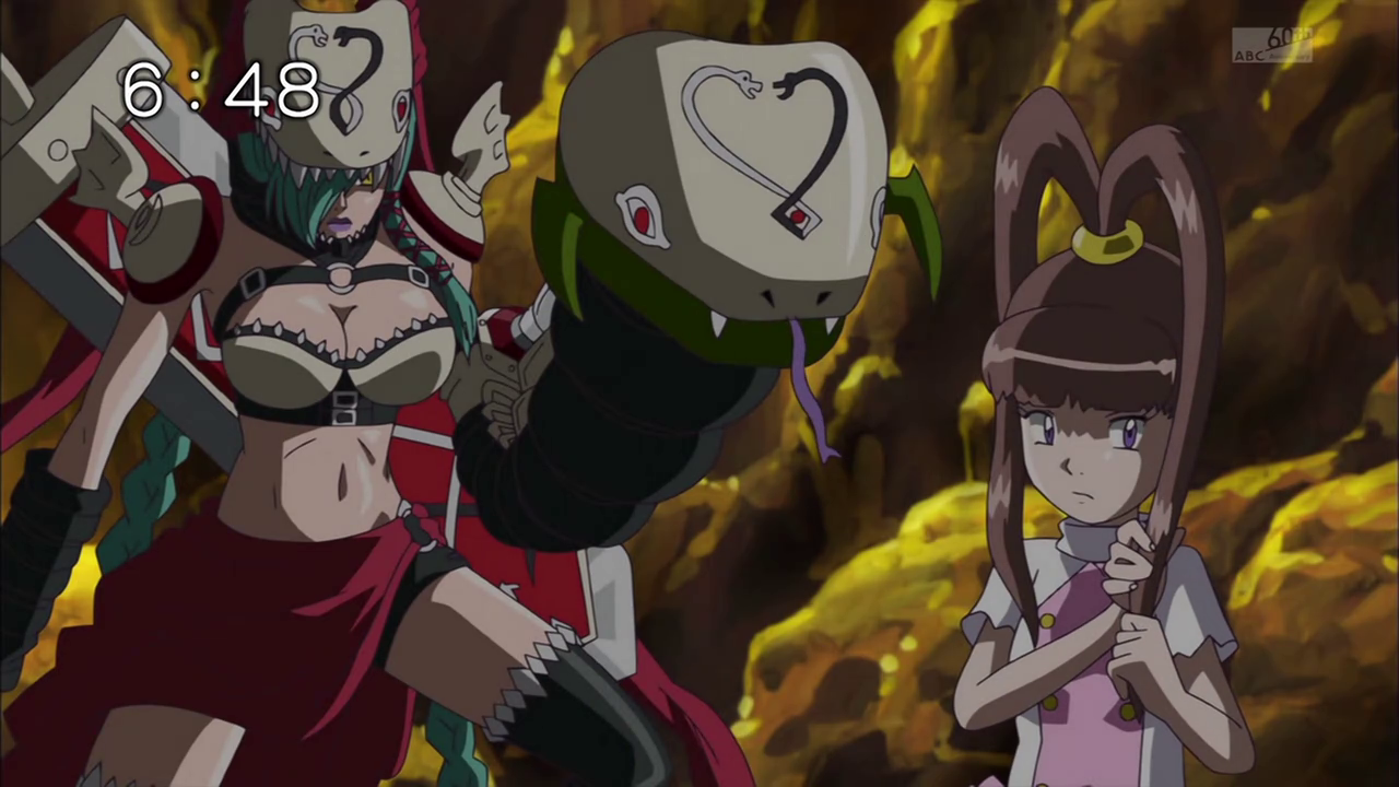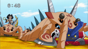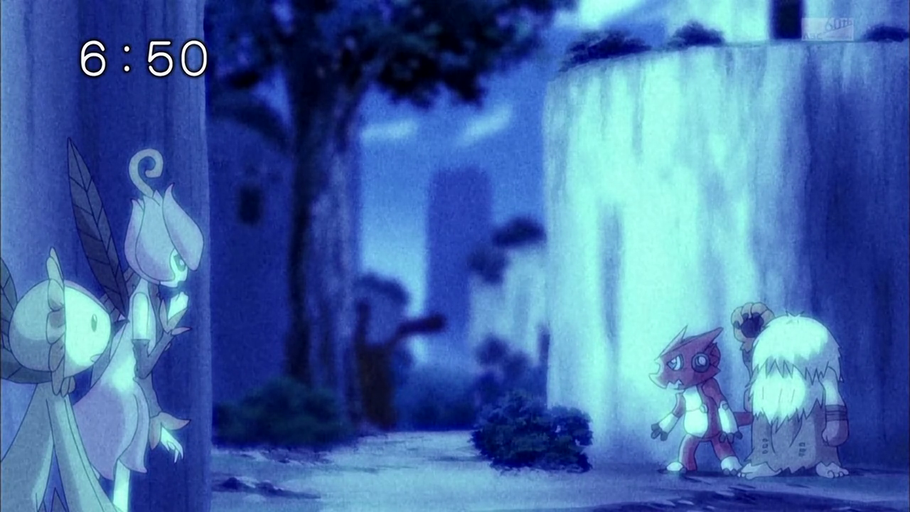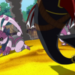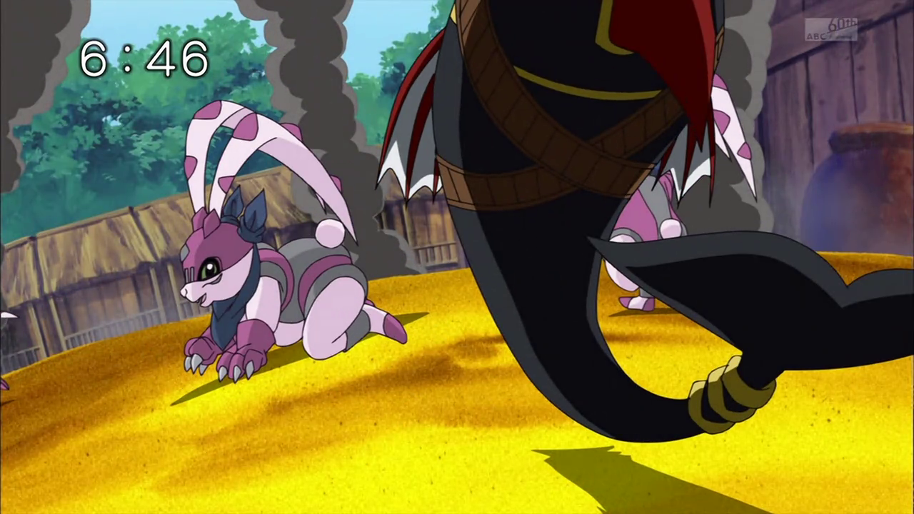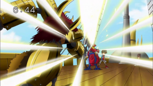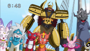 Alrs qu’Olegmon s’apprête à les attaquer, Ballistamon contre ses haches puis ordonne à Taiki d’en profiter pour fuir. Taiki entraine Nene tandis que Kirija accourt vers MailBirdramon. Olegmon essaie de chanter puis s’étonne que Ballistamon y résiste. Il le fixe et semble avoir une compréhension. Au même moment, Taiki ramène dans son X Loader ses digimon amis ceux sous l’influence de l’incantation restent sur le vaisseau. Kiriha constate qu’ils ne peuvent rien et insiste pour fuir. Mermaimon rejoint Olegmon et constate que ces enfants ont pris la fuite mais Olegmon réplique qu’ils ont gagné de nombreux membres. Il ajoute avoir aussi découvert le trésor numéro un qu’il cherchait en se souvenant de Ballistamon.