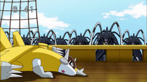Olegmon confirme être fort mais reconnait qu’eux aussi sont plus forts qu’ils n’y paraissent et propose à nouveau de les voir rejoindre son équipage. Shoutmon refuse. Greymon mord son bras et crie à Shoutmon de s’emparer de l’intérieur du vaisseau au moment où Olegmon entonne une chanson. Shoutmon s’approche de la cale ouverte et voit plusieurs attaques fuser. Il découvre, stupéfait, Lunamon, Coronamon et Spardamon sortir en chantant la chanson. Shoutmon reconnait les digimon qu’ils ont sauvé puis les entend dire avoir rejoint rejoint l’équipage d’Olegmon, qu’ils se sont ouvert au mal et que les méchants l’emporteront. Ils continueront de chanter et Shoutmon se bouche les oreilles en les suppliant d’arrêter. Mermaimon encourage ses troupes à chanter en chœur.