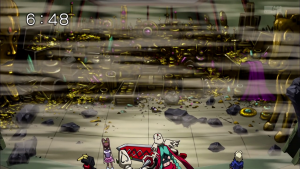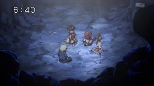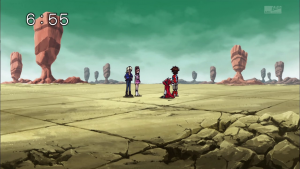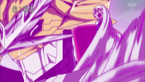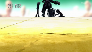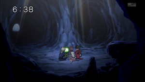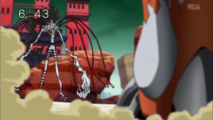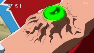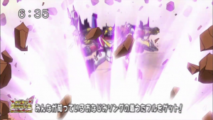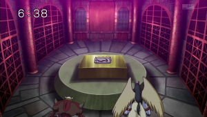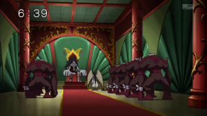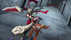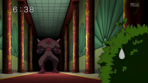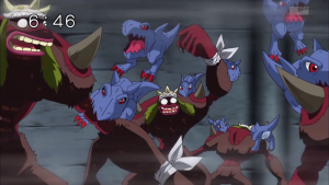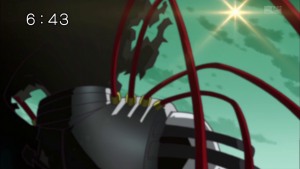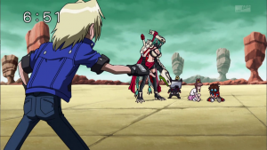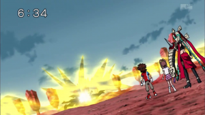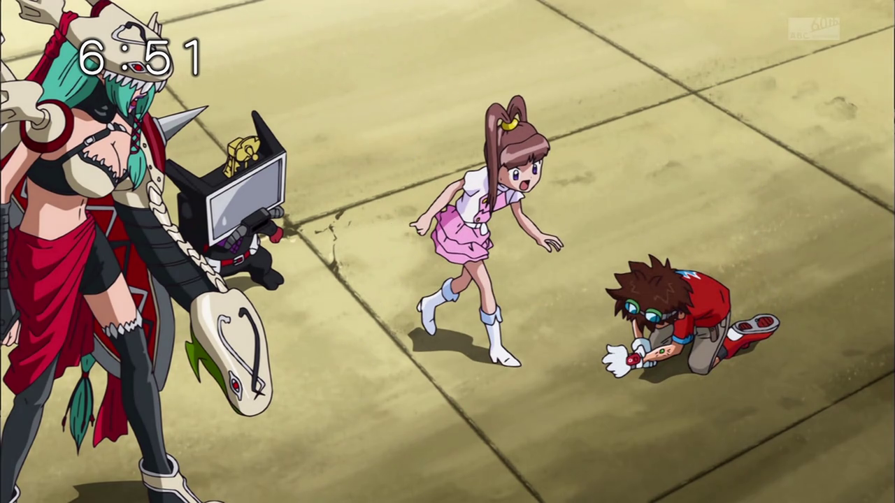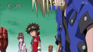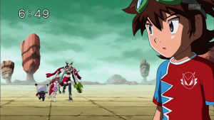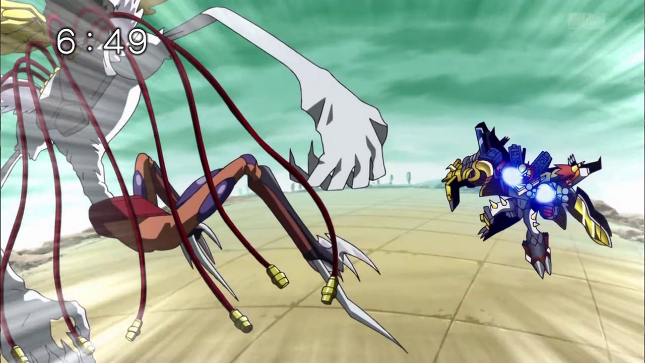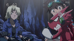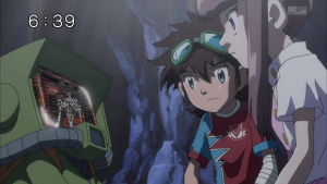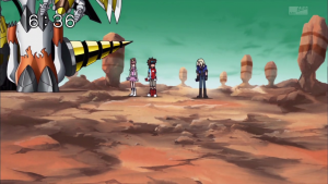 Au même moment, dans la caverne où ils sont cachés, le trio humain observe la scène avec effroi. Nene se demande ce que peut-être la source vitale mais Hi-Vision Monitarimon déclare ne pas savoir puis avoir repéré une pièce secrète. La transmission est brusquement interrompue puis on voit apparaitre un Anubismon qui tient le pauvre espion et considère l’équipe de Xros Heart comme des insolents et leur demande de se rendre au château pour revoir leur otage, là où Gravimon aura raison de Shoutmon 7X.