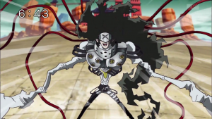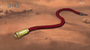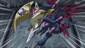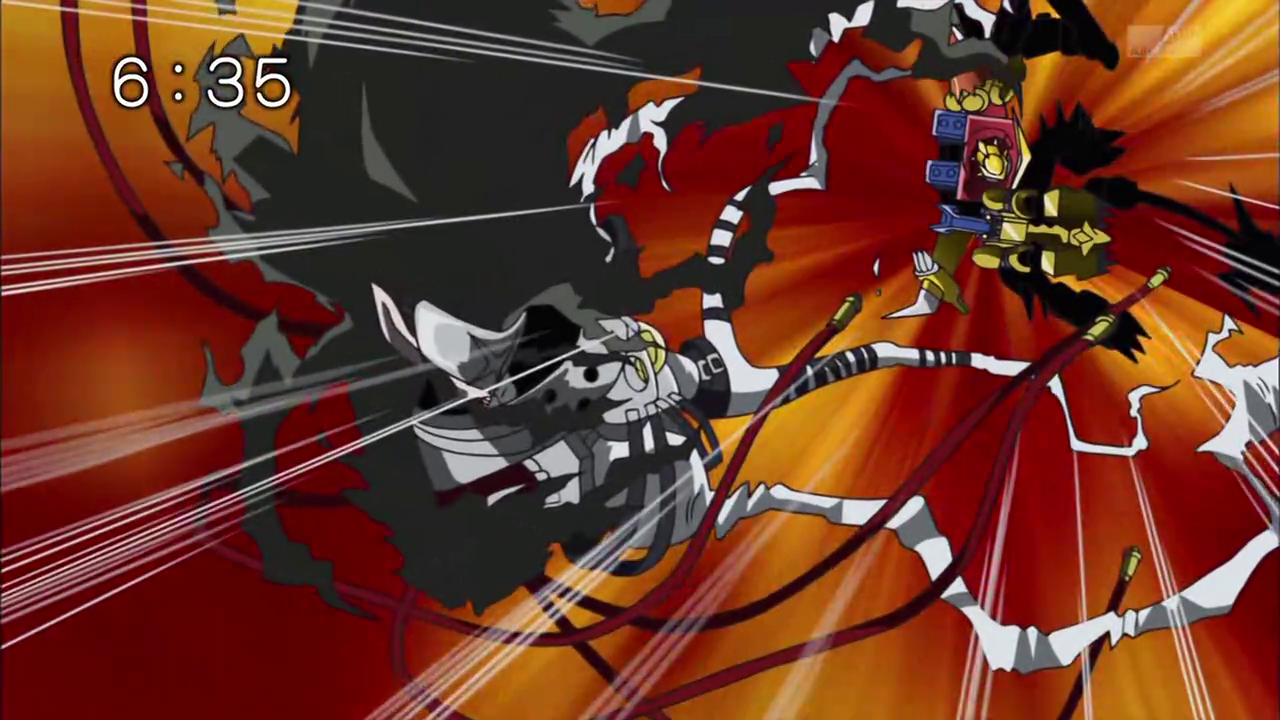 Un peu plus tard, Hi-Monitarimon s’infiltre dans la forteresse et découvre une porte secrète scellée qui lui parait suspecte. Un Wendigomon approche et porte un plateau sur lequel repose le câble rouge. Il franchit la porte et le plateau est posé sur une sorte d’autel. UnAnubismon est présent aussi et annonce que l’équipe de Xros Heart se cache dans la proximité. Le câble rouge réagit, s’illumine et lévite puis se transforme pour devenir Gravimon. Gravimon s’insurge contre ce Shoutmon 7X dont l’attaque serait fatale à n’importe quel digimon, même lui, puis se réjouit de pouvoir se régénérer grâce à sa source vitale caché quelque part.