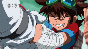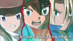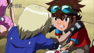 Ces paroles en tête, Kiriha rejoint Taiki et l’observe. Nene est tremblante et l’observe, interrogative, et lui demande s’il va vraiment le faire. Le garçon se rappelle de Taiki qui affirmait croire en lui et s’agenouille pour toucher les épaules de Taiki et répond que bien sûr il ne pourra pas le faire. Il annonce à Gravimon se rendre. Taiki s’exclame qu’il ne peut pas faire cela. Gravimon et le traite d’idiot et que celui-ci choisit le chemin des faibles. Taiki se révolte et crie que Kiriha n’est pas faible. Kiriha le coupe puis se lève et affirme ne pas avoir besoin de la force dont il parle et que si cela ^est être faible il peut l’appeler faible.
