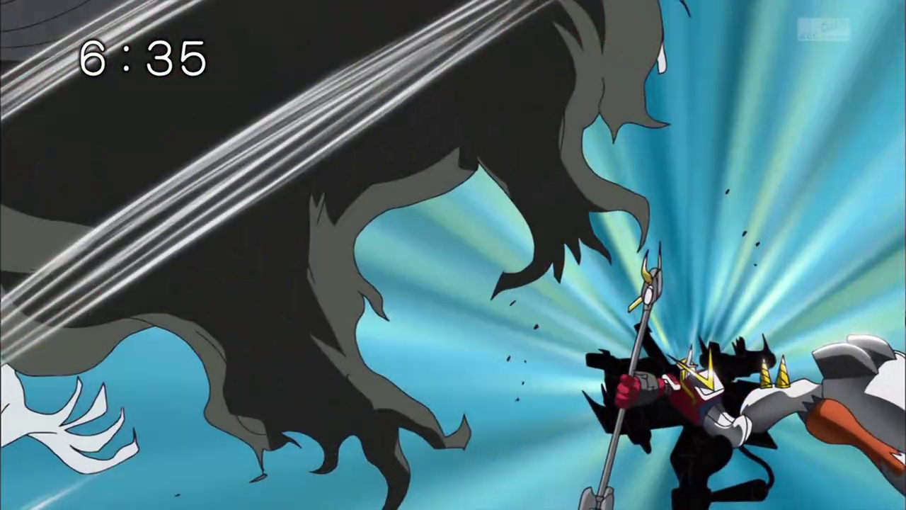 Pendant ce temps, Shoutmon 7X attaque Gravimon qui n’esquive pas. Sa poitrine est blessée mais les domamges se réparent aussitôt. Dans la forteresse, Cyberdramon lutte contre Anubismon tandis que de petits dragons bleurs assaillent les Wendigimon. Kiriha crie à Nene de le laisser combattre et de poursuivre les recherches. Sur le champ de bataille, les Kentarumon arrivent à blesser GreatCutemon qui se met à pleurer. Beelzebumon se décide à le couvrir en tirant. Dans al forteresse, Nene réussit à rejoindre HI-Vision Monitarimon qui est fou de joie puis lui demander de le conduire dans la fameuse pièce secrète. Durant ce temps, Cyberdramon réussit à battre Anubismon qui termine contre un mur. Kiriha se doute que ce sera une perte de temps mais demande s’il sait où se trouve la source vitale de Gravimon.  Anubismon répond l’ignorer mais que même s’il le savait il ne dirait rien. Il ajoute que même s’il lui disait, cela ne suffirait pas pour battre Gravimon. Kiriha demande ce que cela signifie et Anubismon ricane en s’exclamant qu’il regrettera son changement d’esprit puis meurt sur ces paroles.