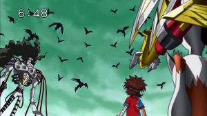 A un moment, Gravimon réussit à les saisir entre ses mains et se réjouit de son triomphe puis les relâche violemment au sol. Gravimon se pose au sol et décide de lui dire une chose gentille : il doit tuer Kudo Taiki. Kiriha marmonne qu’il lui a déjà fait cela mais Gravimon renchérit dire la vérité. A ce moment, Taiki éprouve une douleur terrible à son coude. Kiriha demande à Gravimon ce qu’il lui a fait et Gravimon explique qu’à moins de détruire as source vitale, qui est comme un cœur, il pourra continuellement régénérer puis que cette source vitale peut se déplacer selon sa propre volonté. Kiriha comprend enfin : la source vitale est dans le corps de Taiki. A cet instant, le bandage de Taiki explose et un point vert apparait au coude. Gravimon relate avoir profité de la confusion de la précédente bataille pour transférer sa source vitale dans le bras de Taiki.