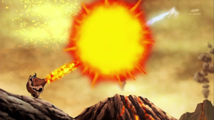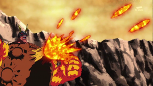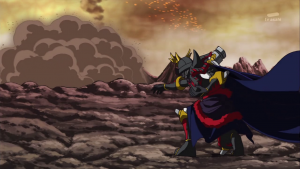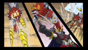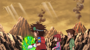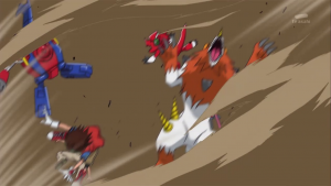Taiki obéit et Shoutmon, équipé des pattes de Dorurumon, vise AncientVolcamon et le repousse. Il reprend la forme initiale puis Taiki réalise une digixross entre Shoutmon, Ballistamon et Dorurumon qui donne naissance à Shoutmon 3X. Il lance son boomerang pour arrêter l’arrêter l’attaque d’AncientVolcamon puis l’arme détruit dans le dos le digimon.