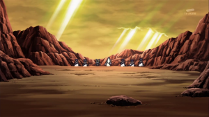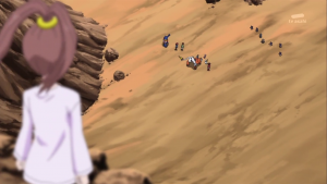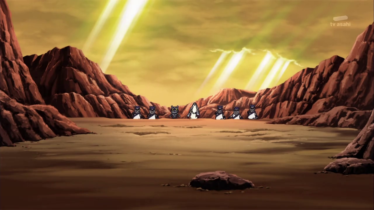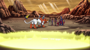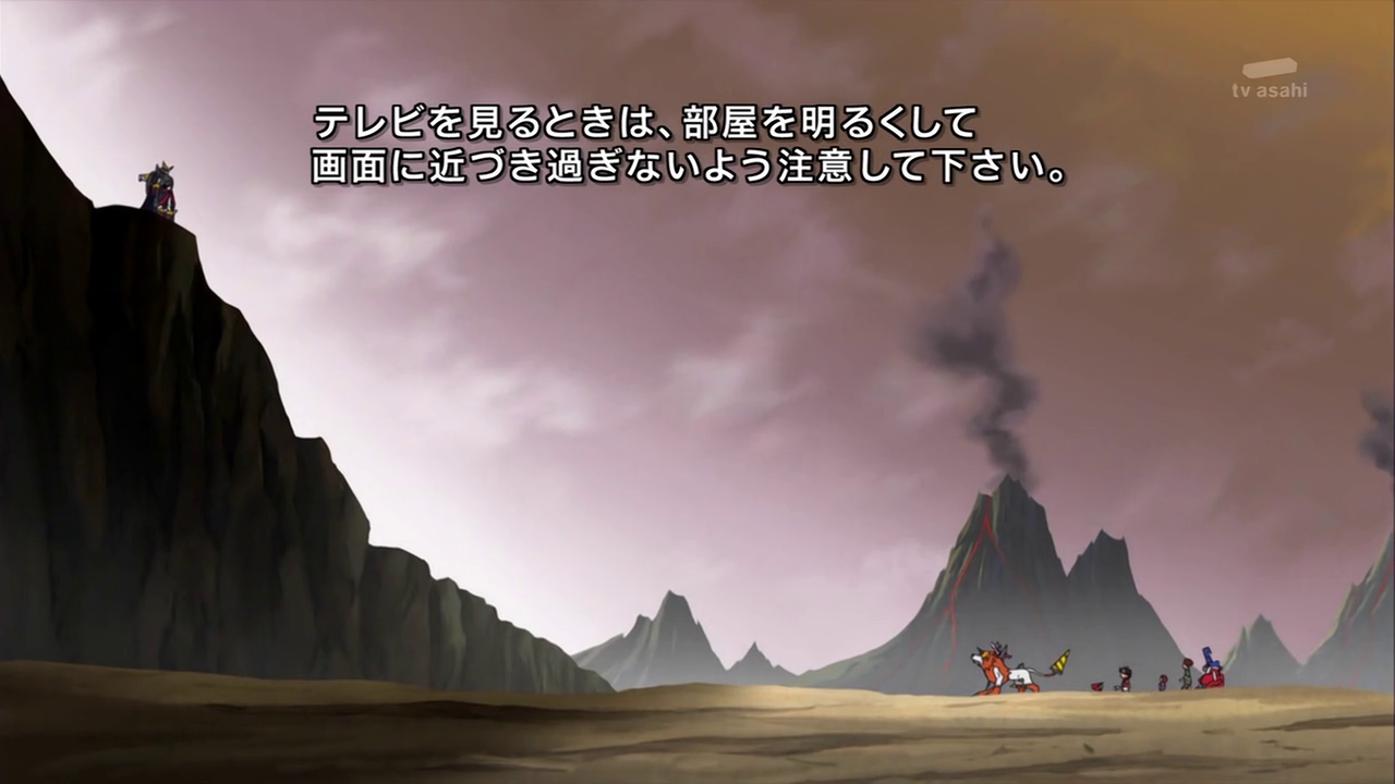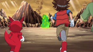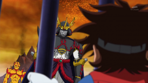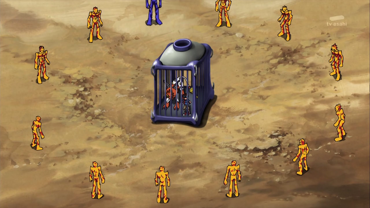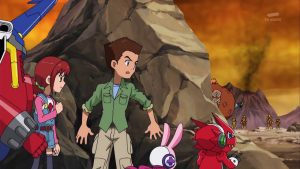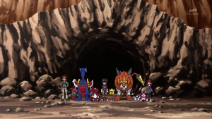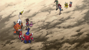 Dissimulé non loin de là, Shoutmon et les autres observent Tactimon demander à AncientVolcamon de préparer l’exécution. Akari n’arrive pas à croire que Dorurumon ait pu travailler pour l’empire Bagura et Zenjirô ajoute que celui-ci est peut-être responsable de l’attaque du village de Cutemon. Cutemon proteste et refuse d’y croire. Zenjrô essaie de songer à un moyen de délivrer leurs camarades et Shoutmon rappelle que Tactimon est trop fort pour eux et ils ne peuvent compter sur l’aide de Taiki sans son X Loader.
