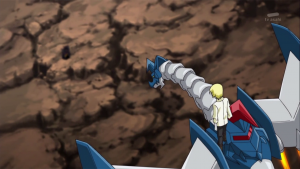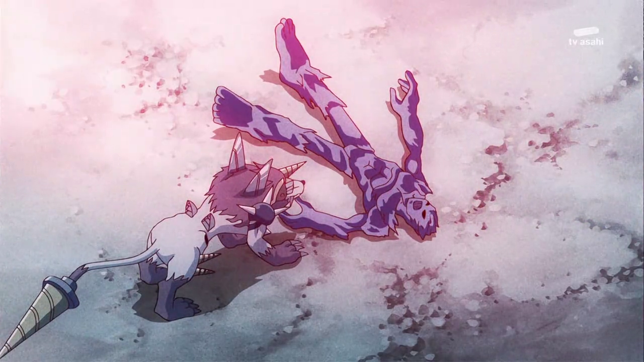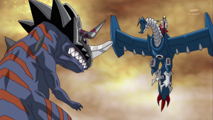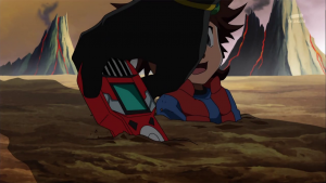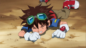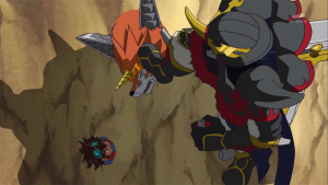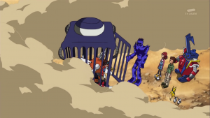 Tactimon s’approche pour fixer ses deux prisonniers et ramasse ensuite le X Loader rouge. Il déclare à Taiki que sans cela, il n’est rien d’autre qu’un petit enfant. Il écrase ensuite la figure de Dorurumon de son pied et annonce qu’en vertu des lois de l’empire Bagura ils connaitront la pire exécution possible.