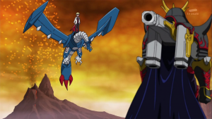 Durant ce temps, la bataille se poursuit et Tactimon réussit à saisir le cou de MailBirdramon puis tous deux s’envolent.