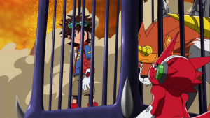 Profitant de cette diversion, Shoutmon et les autres rejoignent la cage où sont enfermés Taiki et Dorurumon. Shoutmon veut les libérer mais Akari rappelle qu’ils n’ont pas al clé. BlueMeramon arrive devant eux et ouvre pour eux sous la surprise de Taiki. BlueMeramon expose rembourser une dette auprès de Dorurumon. Cutemon demande quelle dette mais BlueMeramon répond que la priorité est de s’échapper. Taiki souhaite avant tout récupérer son X Loader et BlueMeramon considère qu’il faut alors tirer avantage de la bataille entre Tactimon et MailBirdramon qui créent de la fumée partout et les dissimulent.