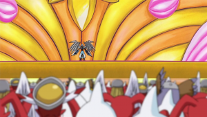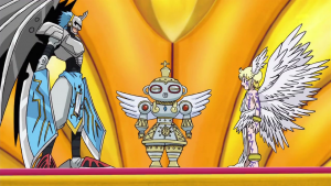 Peu après, Lucemon rejoint SlashAngemon qui le félicite pour la pureté de son cœur puis propose de passer à l’intronisation. Shakkoumon apparait devant eux en chantant. Shoutmon suppose que ce dernier essaie de saborder la paix de Heaven Zone et s’apprête à l’attaquer mais Shakkomon l’expédie au sol d’un geste. A ce moment, SlasgAngemon révèle que Shakkoumon est l’administrateur de l’élection. Une lueur enveloppe Shakkoumon puis il retire le bracelet du bras de SlashAngemon puis se tourne vers Lucemon pour le complimenter sur ses études et sa gentillesse envers les gens. Il n’ajoute n’avoir aucun reproche à lui adresser. taiki est surpris d’apprendre que Shakkoumon avait une telle position et ce dernier explique que son travail consiste à observer les candidats aux élections afin de vérifier que le code couronne ne soit pas remis à une mauvaise personne et doit donc demeurer secret afin de garder une impartialité totale. Il s’en excuse. Taiki se souvient alors des paroles de Lucemon au sujet du code couronne scellé.