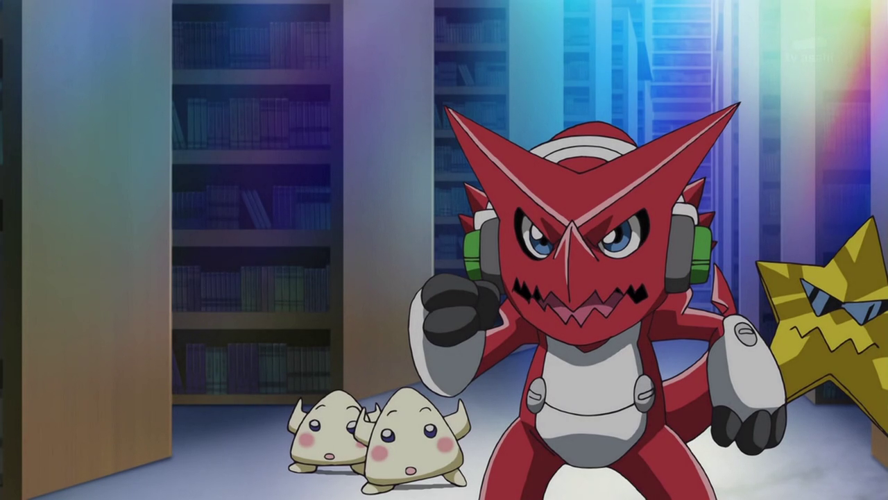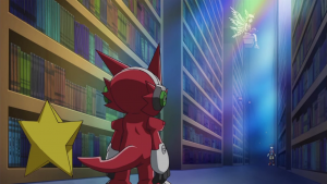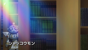 Après une courte errance dans le bâtiment, Shoutmon retrouve Lucemon dans une bibliothèque, lisant un livre sur le haut d’une échelle. Il s’excuse de son retard puis explique venir ici chaque jour pour étudier une heure puis ajoute que cela ne change pas grand chose puisqu’il a a déjà lu tous les ouvrages de la pièce. L’information laisse Shoutmon pantois lorsque Taiki les rejoint. Après le départ de Taiki et lucemon, Shoutmon prend conscience qu’un président est comme un roi puis se demande s’il devarit autant étudier et estime ensuite qu’il s’endormirait de lire autant d’ouvrages.