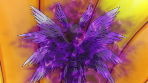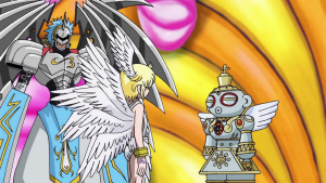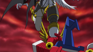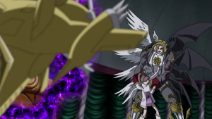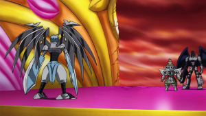 Dans Heaven Zone, Lucemon révèle que Lilithmon lui avait donné pour ordre d’éliminer l’équipe de Xros Heart mais il a préféré les utiliser pour prendre le pouvoir. Shoutmon est révolté par son imposture. Il s’exclame qu’il avait gagné son respect et que les habitants de la Zone lui avaient offert leurs cœurs. Shoutmon s’élance pour l’attaquer mais est stoppé par un tir venu de l’arrière. La voix de Nene résonne et leur ordonne d’arrêter. Elle est accompagnée d’un mystérieux digimon effrayant : DarkKnightmon.